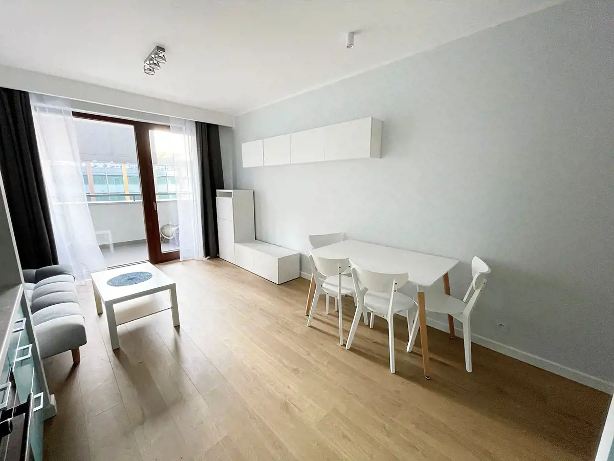 Salon umeblowany jest w rozkładaną sofę, stolik kawowy, stół z krzesłami, szafkę RTV oraz z wyjściem na balkon.
