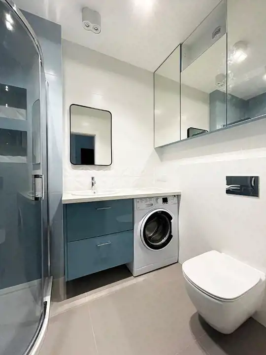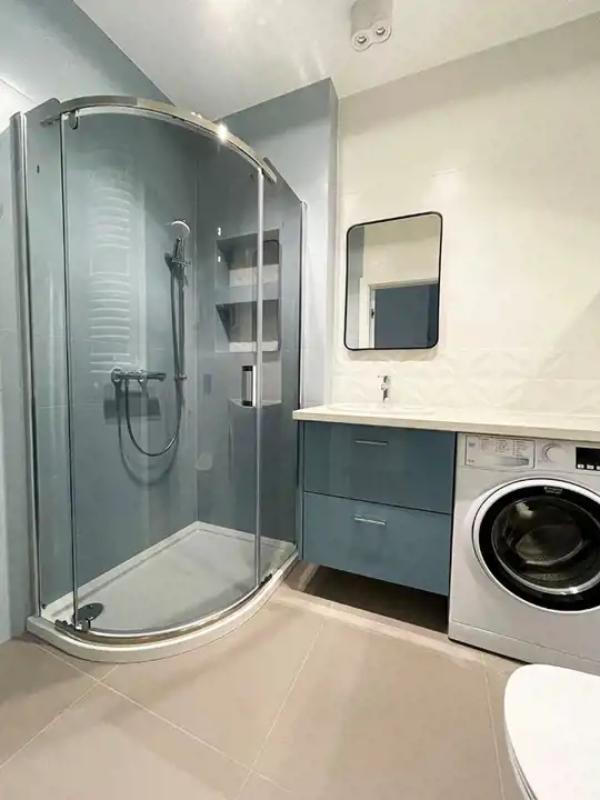 Łazienka wyposażona jest w prysznic, umywalkę z szafką, pralkę, szafki na kosmetyki oraz WC.