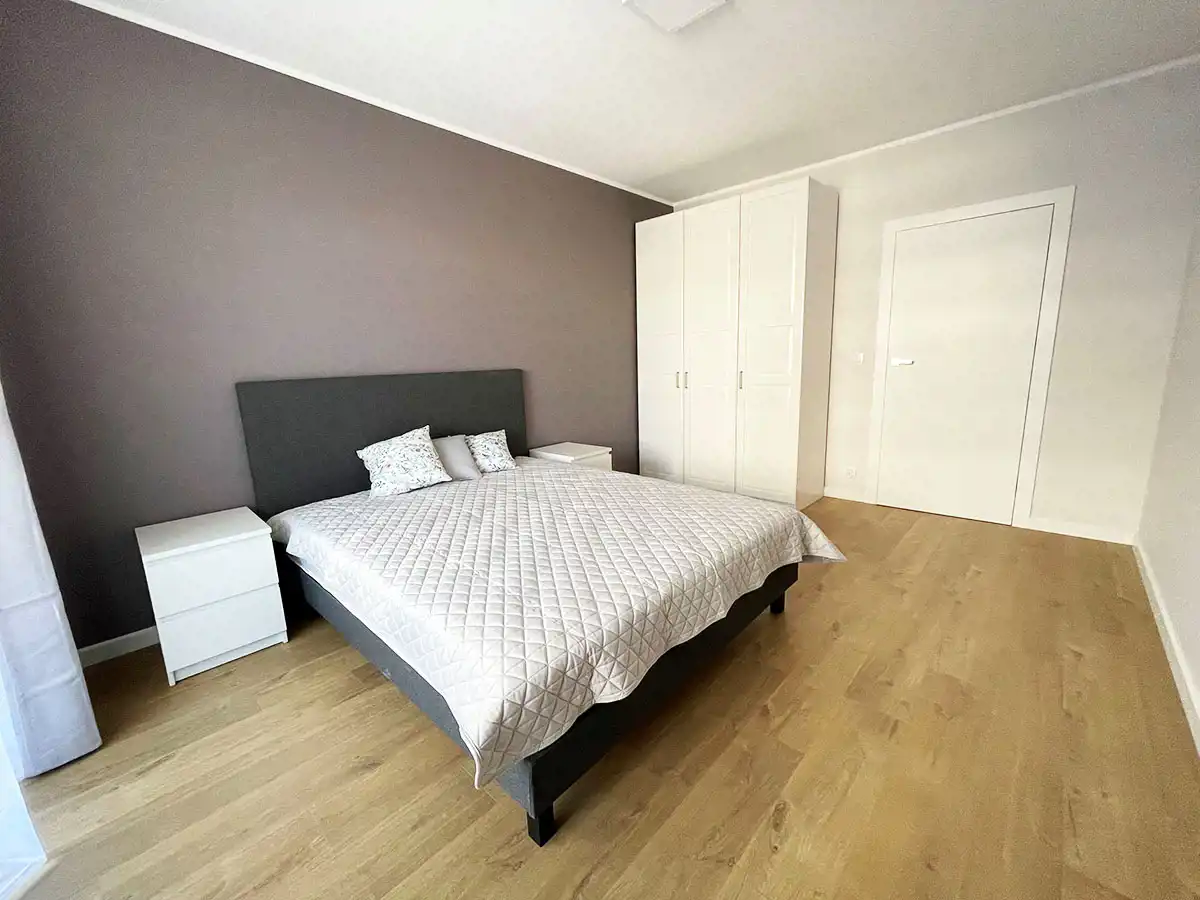 Duża sypialnia z łóżkiem dwuosobowym, szafą oraz wyjściem na drugi balkon.