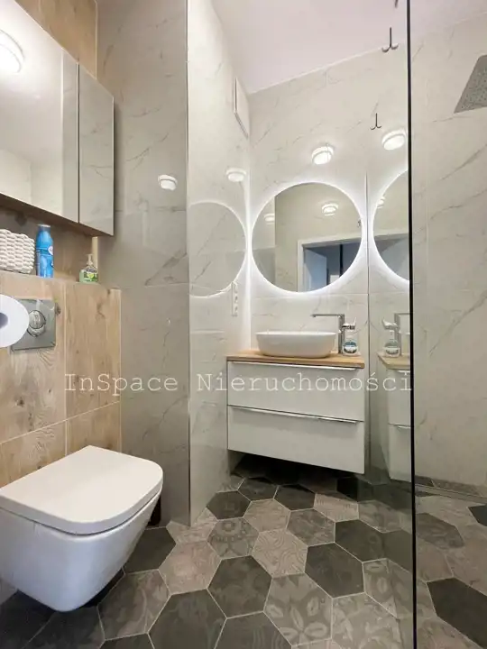 -Łazienka wyposażona w kabinę prysznicową, umywalkę, szafki, oraz WC.