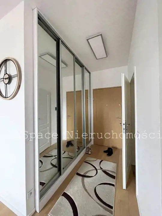 -W przedpokoju znajdują się duża szafa w zabudowie a w niej pralka. Na wyposażeniu jest również odkurzacz, żelazko, deska do prasowania.