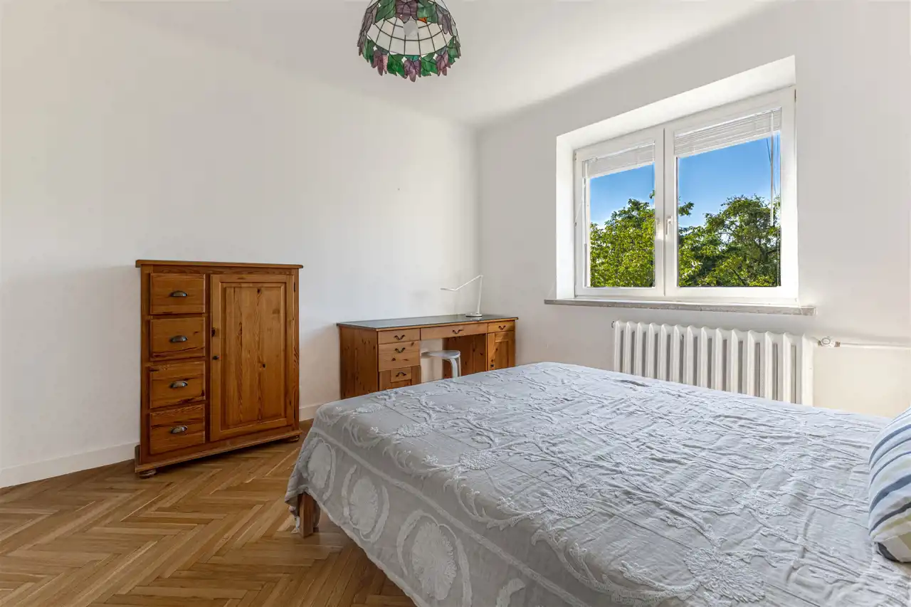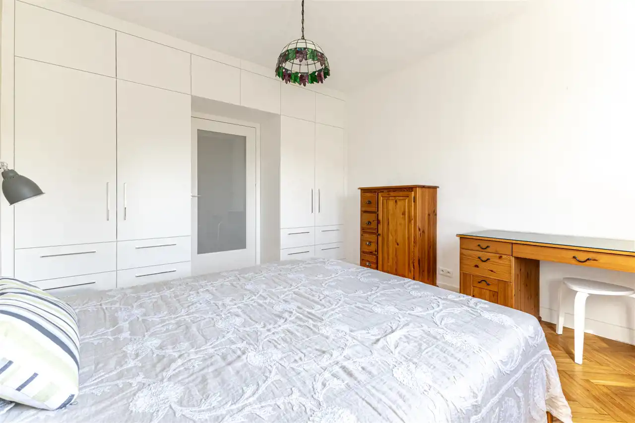 - Sypialnia: Duża szafa w zabudowie, łóżko, biurko, komoda