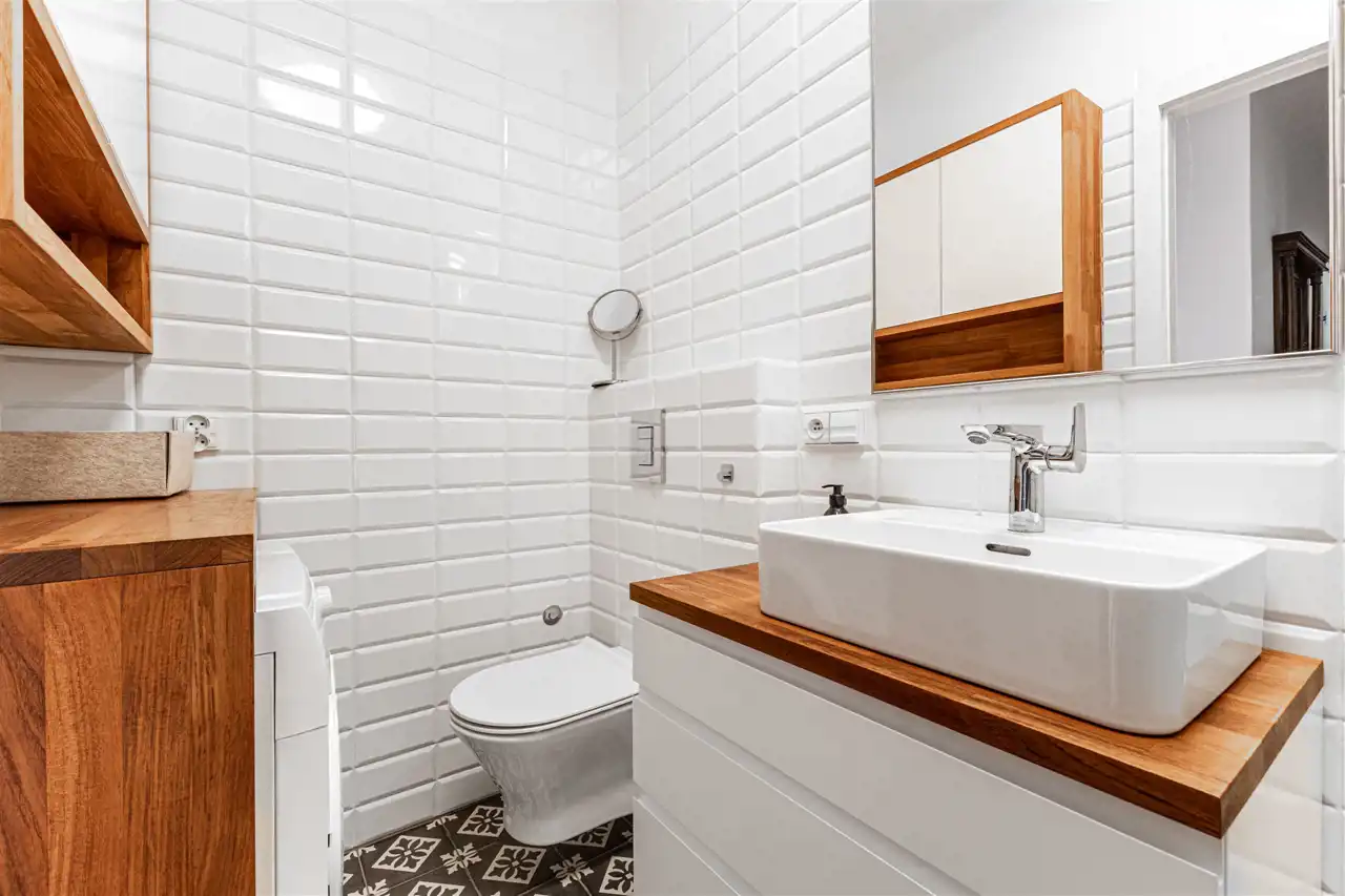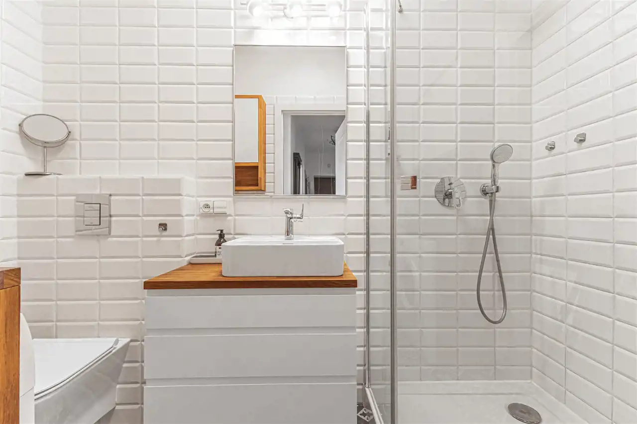 - Łazienka: kabina prysznicowa, umywalka, szafka, pralka, WC