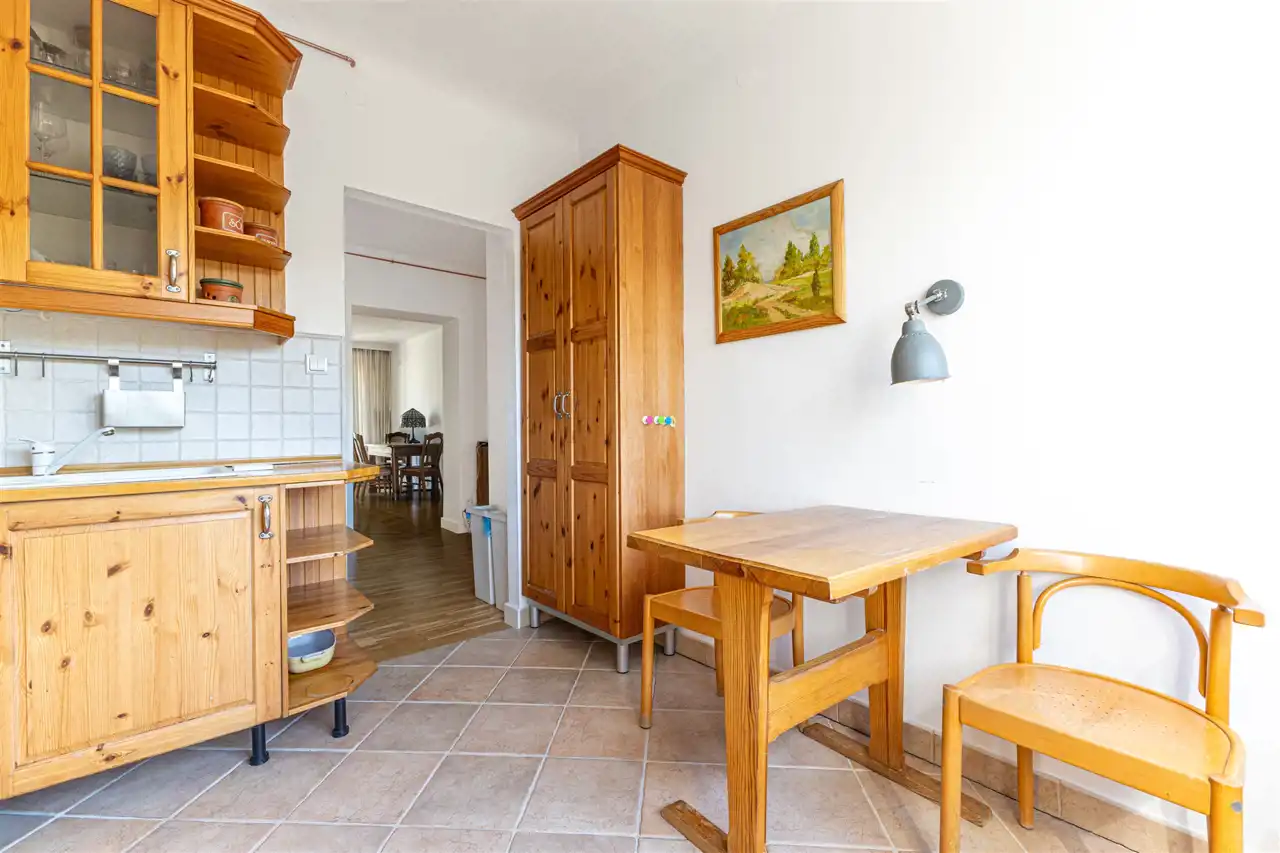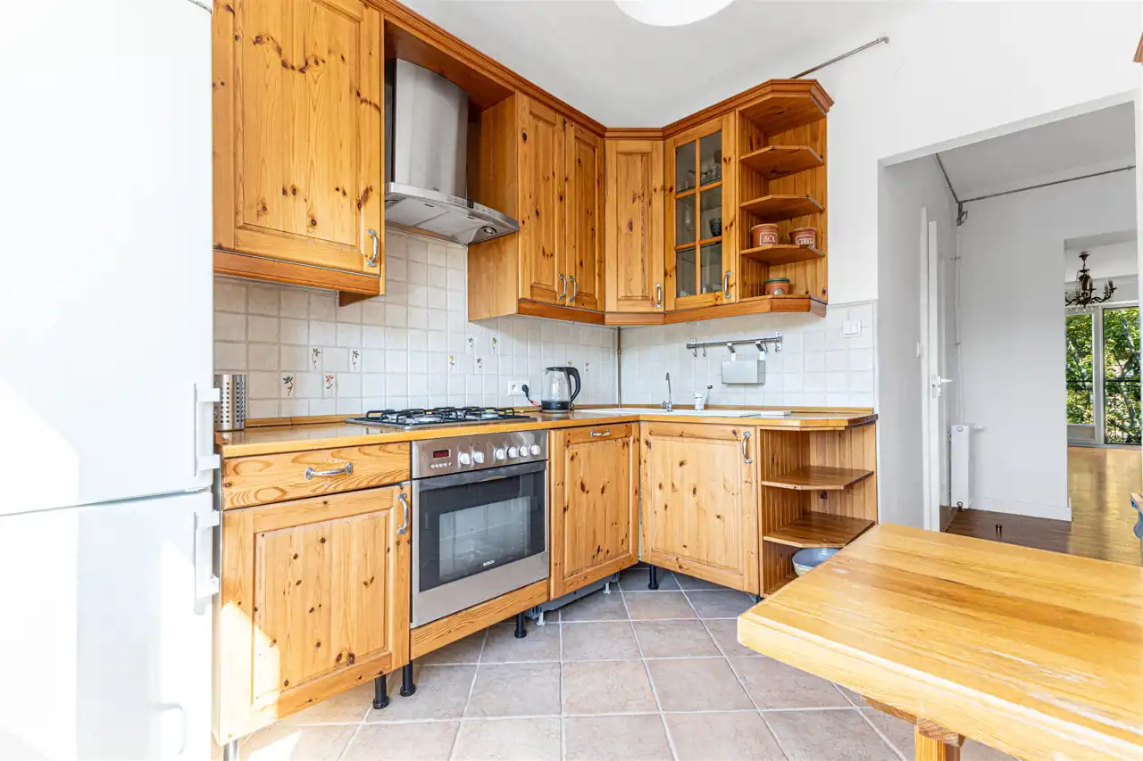 - Kuchnia: Lodówka, płyta gazowa, zmywarka, piekarnik, okap, stół, krzesła