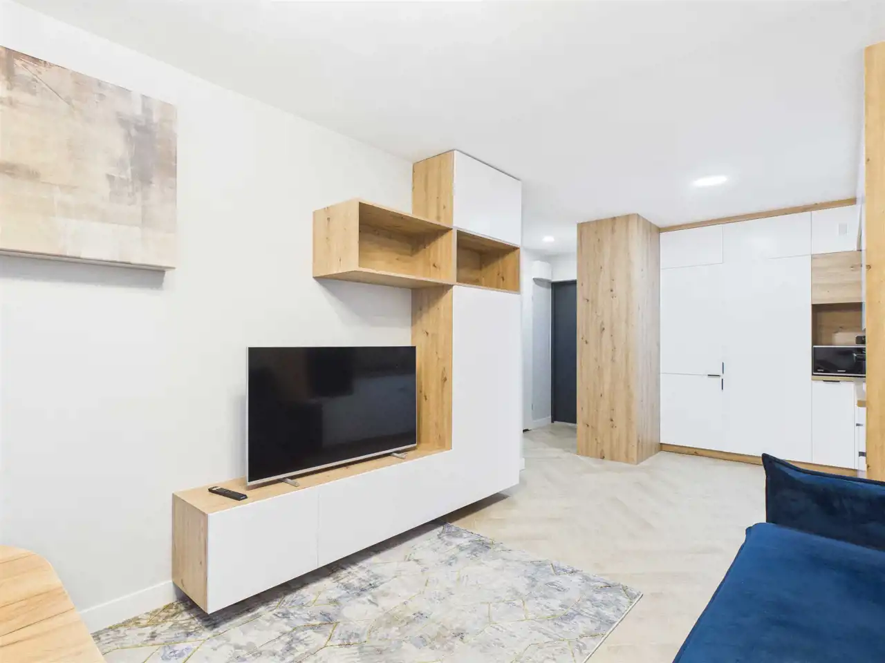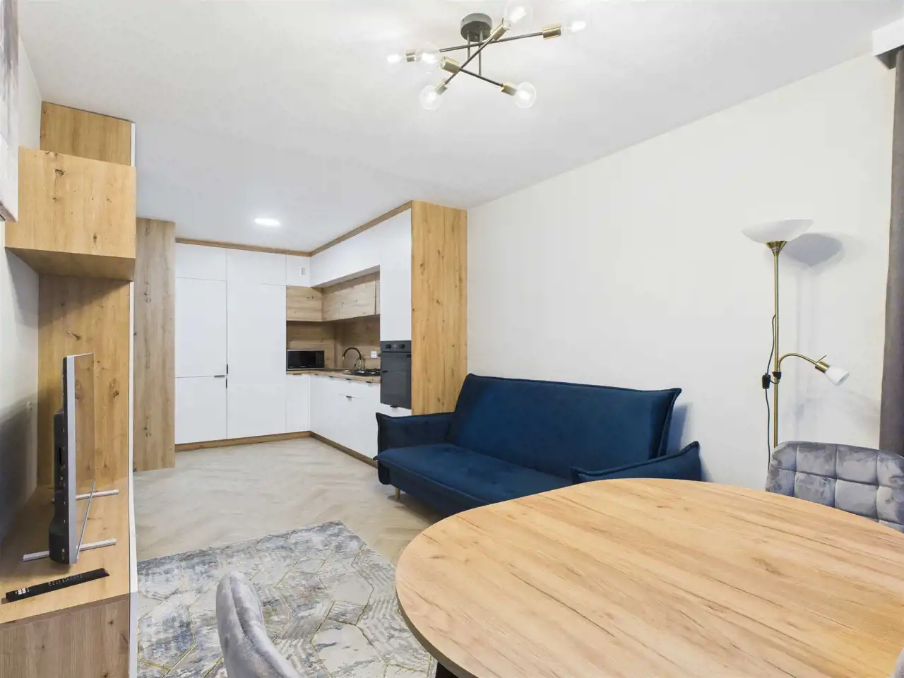 --> salon z aneksem kuchennym ok. 23 m2 z wyjściem na balkon, w pełni wyposażony: kanapa rozkładana, stół z krzesłami, zmywarka, płyta gazowa, piekarnik, okap, lodówko-zamrażarka, pralko-suszarka, TV