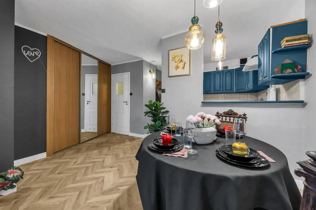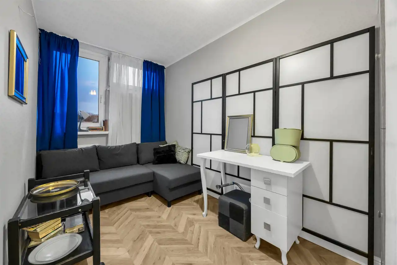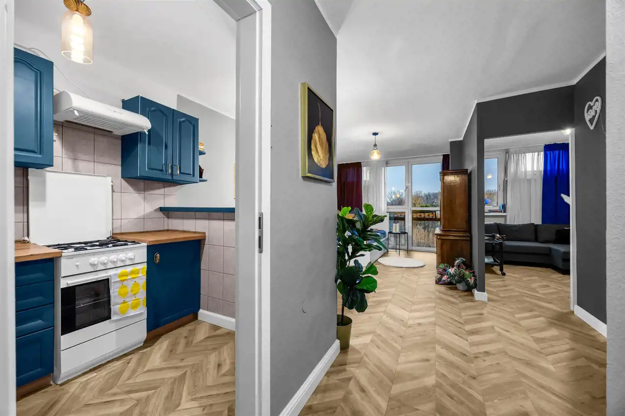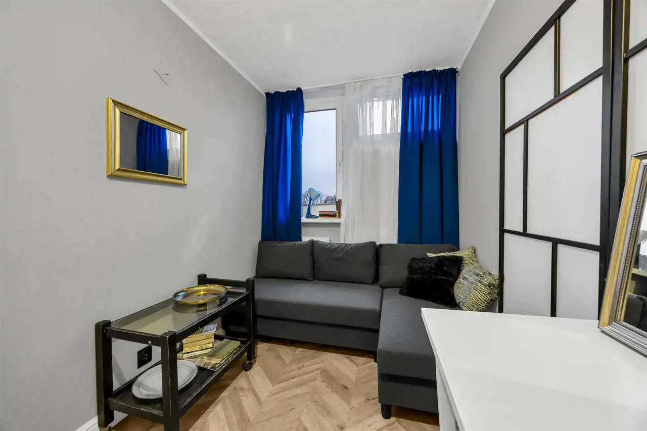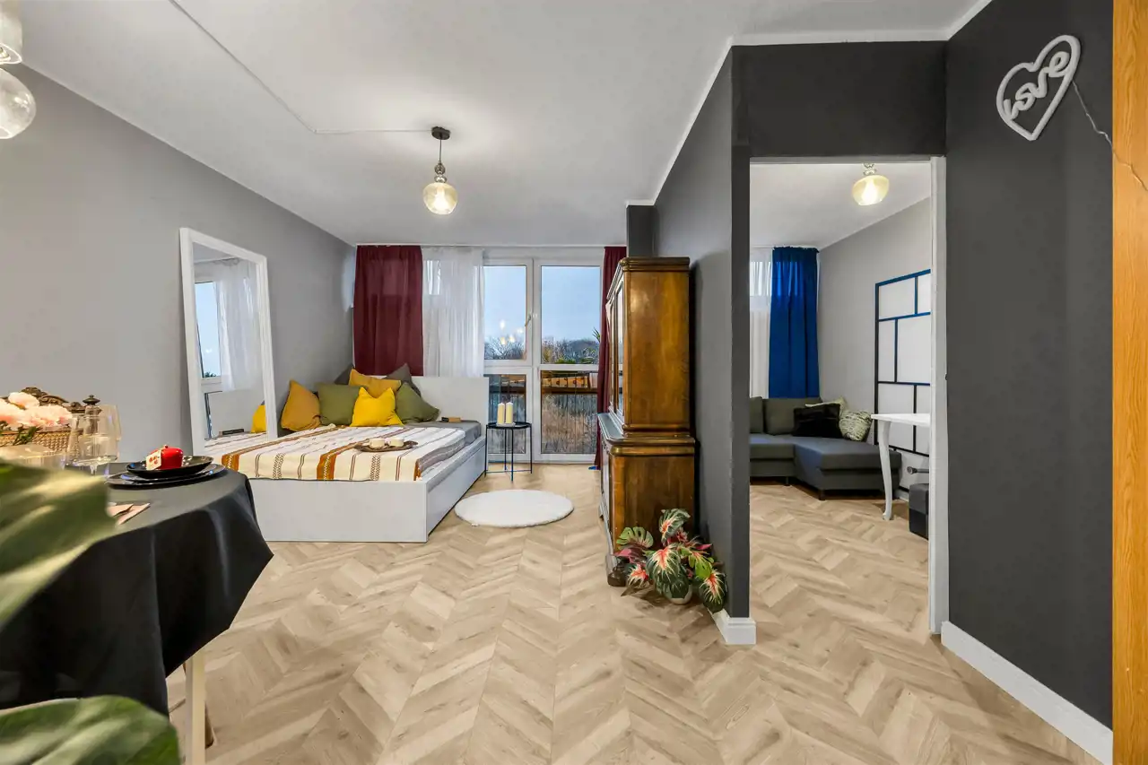 Mieszkanie wyposażone w wygodne łóżko z materacem 200 × 140 cm, nową sofę, pralkę, szafki kuchenne z podstawową zabudową, funkcjonalną garderobę i inne miejsca do przechowywania.