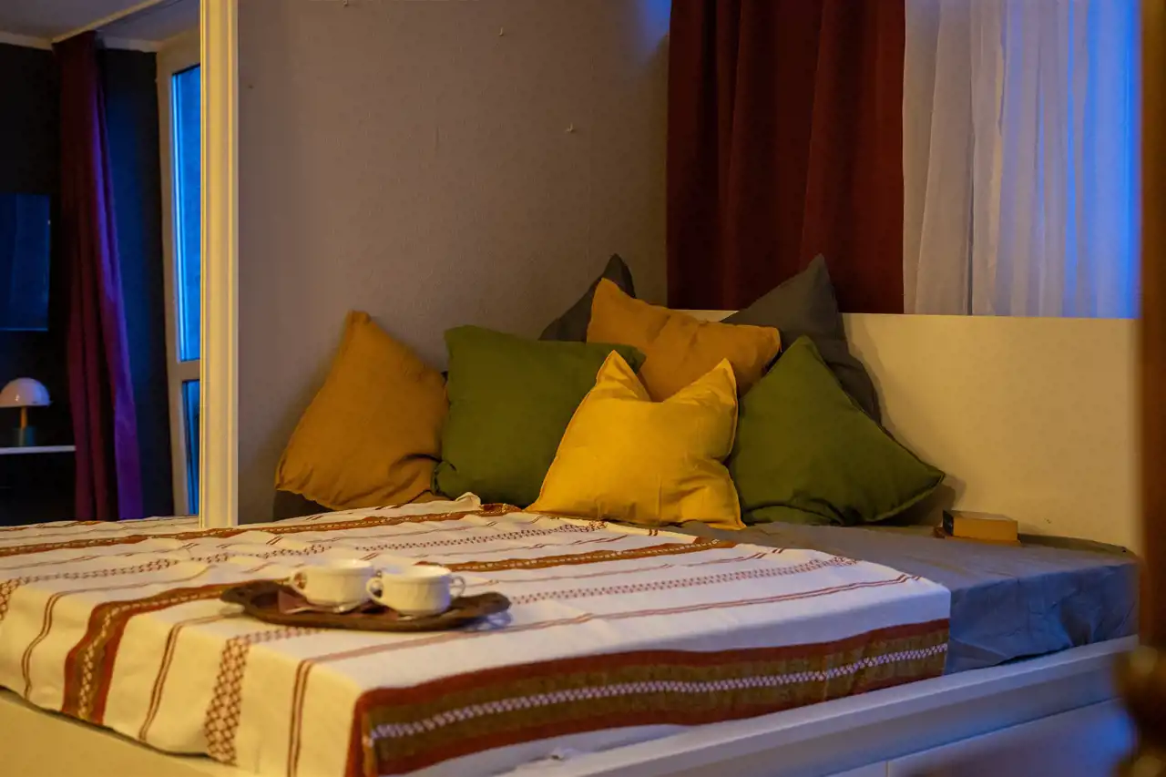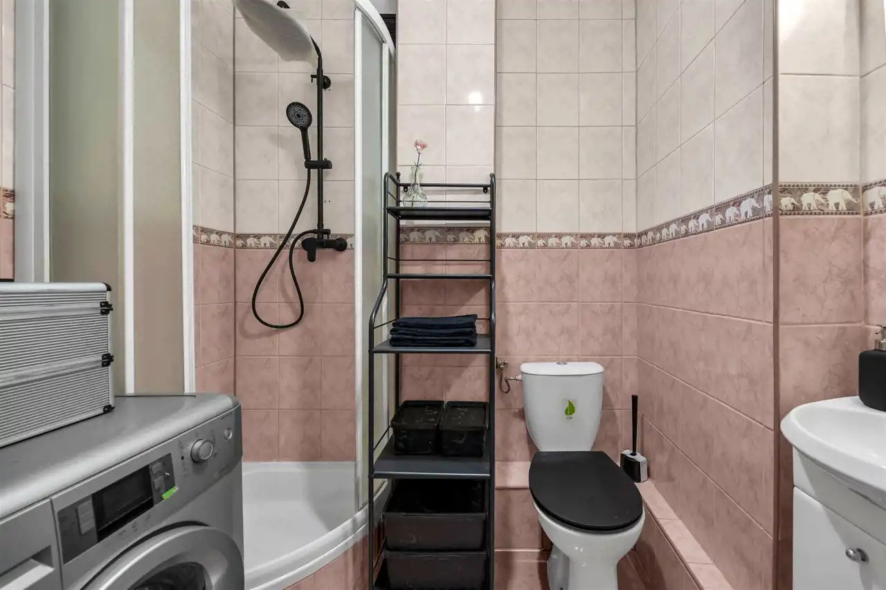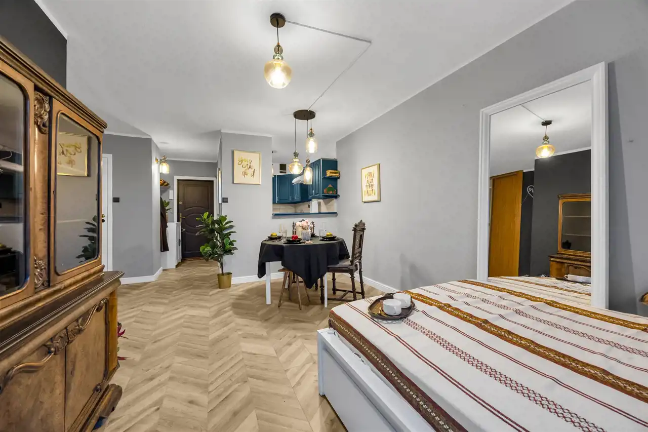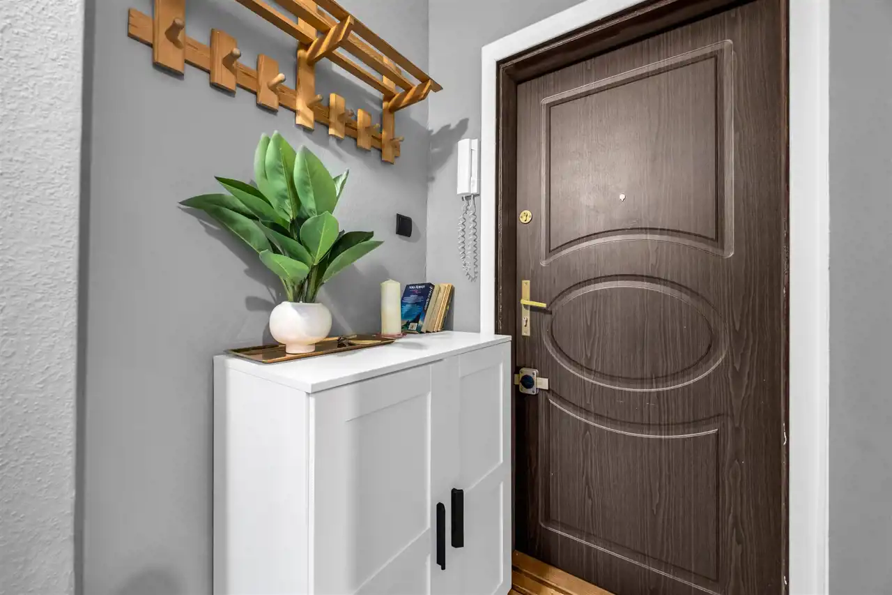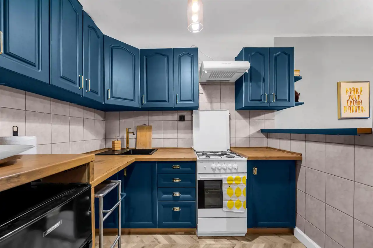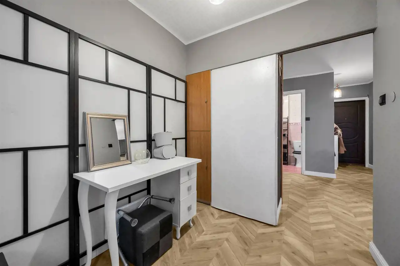 Mieszkanie wyposażone w wygodne łóżko z materacem 200 × 140 cm, nową sofę, pralkę, szafki kuchenne z podstawową zabudową, funkcjonalną garderobę i inne miejsca do przechowywania.