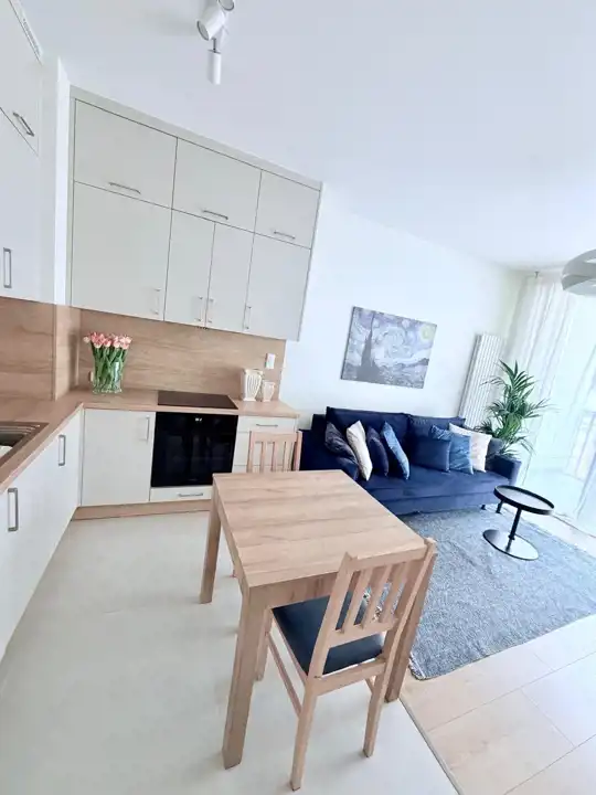 Lokal jest w pełni umeblowany i wyposażony w sprzęt AGD (lodówka, kuchenka, piekarnik, pralka) — gotowy do wprowadzenia.
