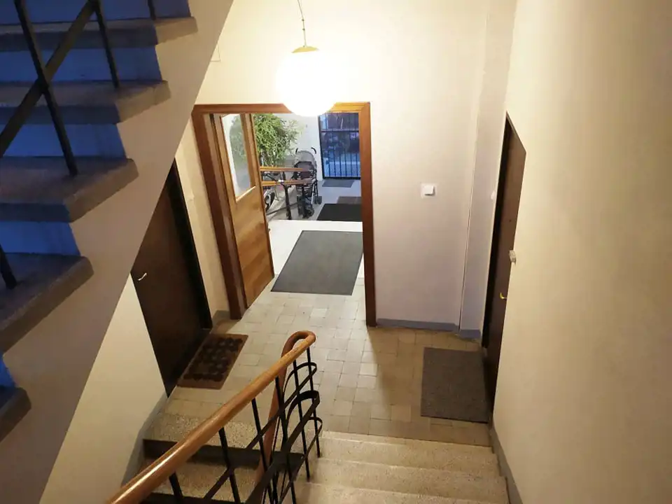 Odnowiona kamienica, elegancka klatka schodowa.