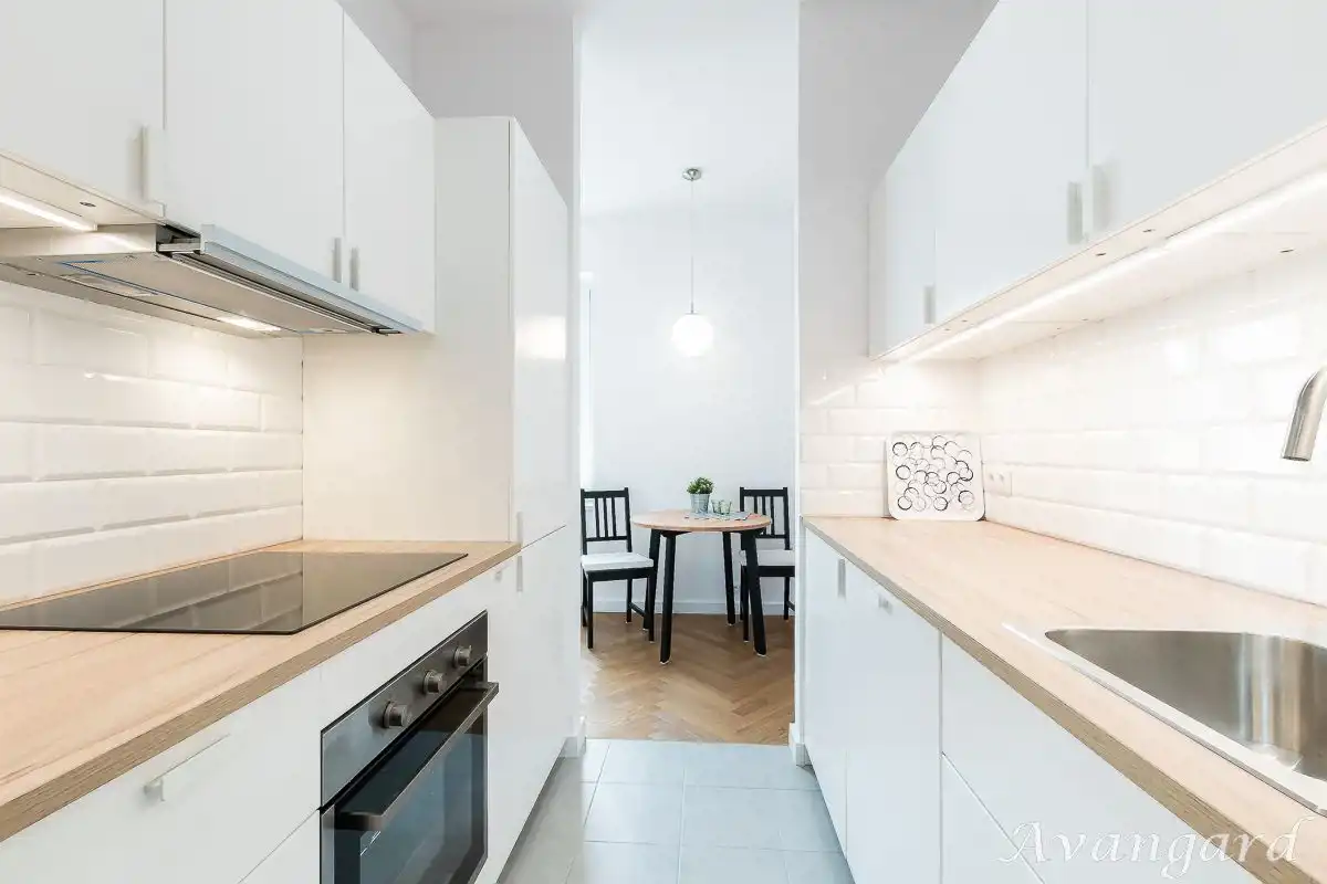 Kuchnia przechodnia z przylegającą częścią stołową.