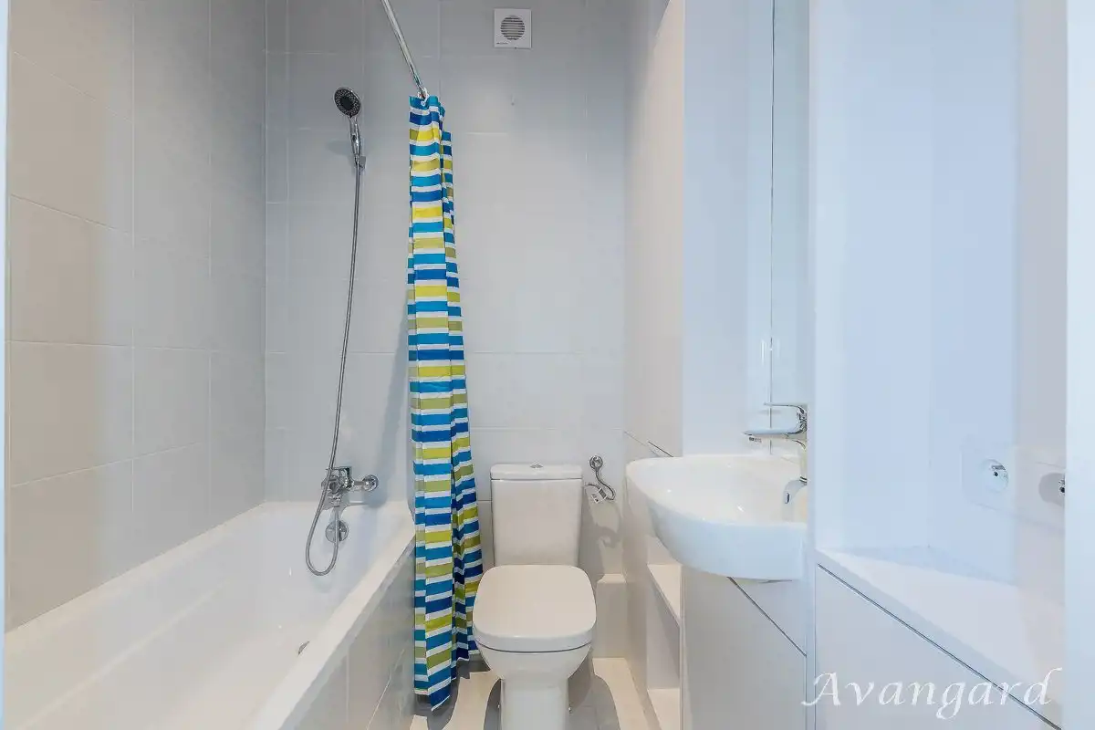 ŁAZIENKA: wanna z zasłoną prysznicową, umywalka, szafki w zabudowie, toaleta;