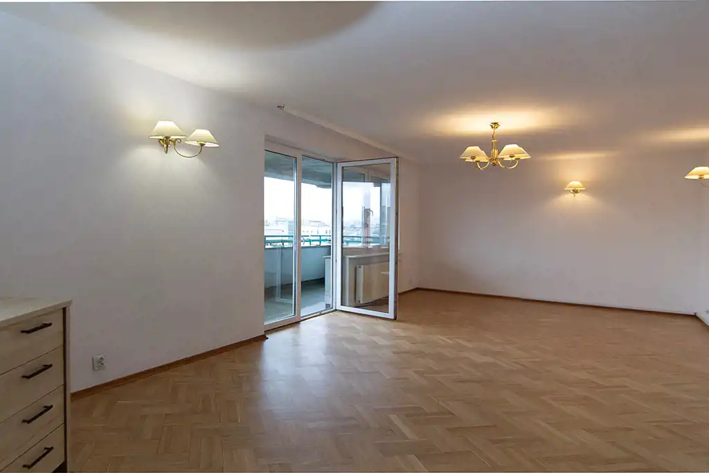 przestronny salon z aneksem kuchennym (ok. 32 m²) z wyjściem na duży balkon (ok. 7,5 m²), ekspozycja południowo-zachodnia