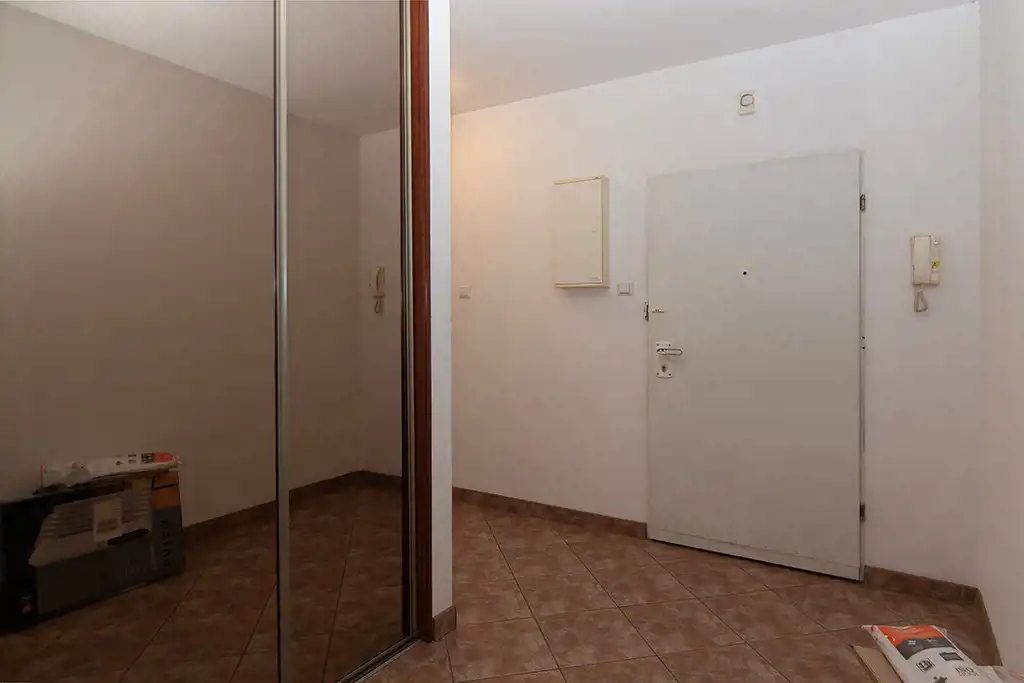 Mieszkanie jest nieumeblowane, wyposażone w nową zabudowę kuchenną (zmywarka, kuchenka elektryczna z piekarnikiem, okap), zabudowę łazienkową oraz szafy wnękowe.