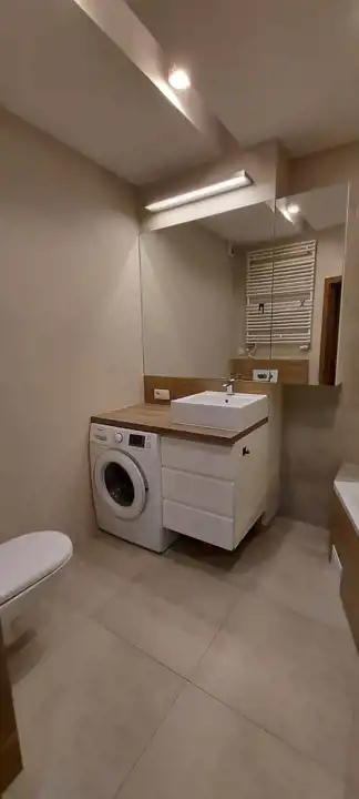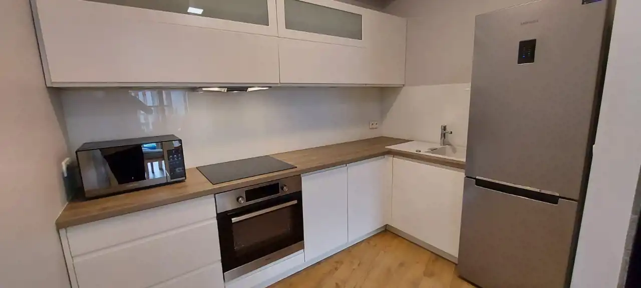 Mieszkanie usytulowane jest na pierwszym piętrze, w pełni wyposażone (zmywarka, lodówka, mikrofalówka, piekarnik, płyta indukcyjna, pralka). Składa się z: