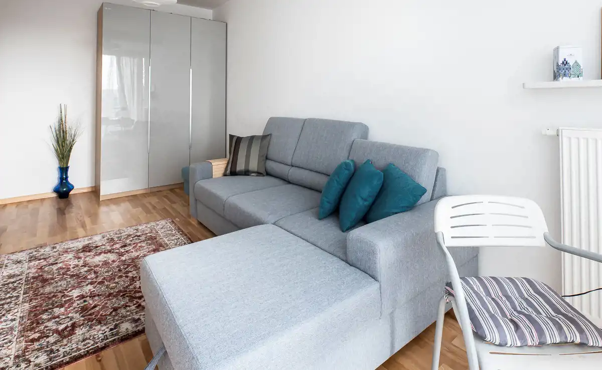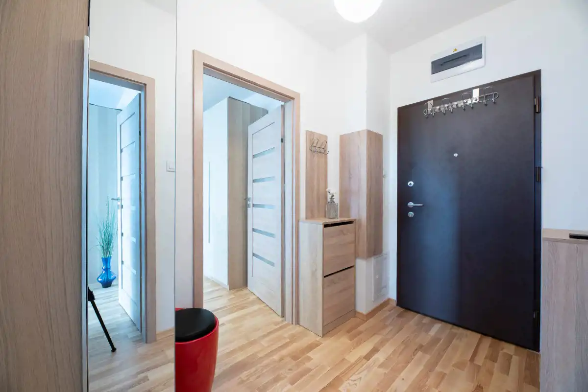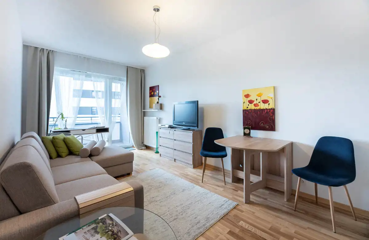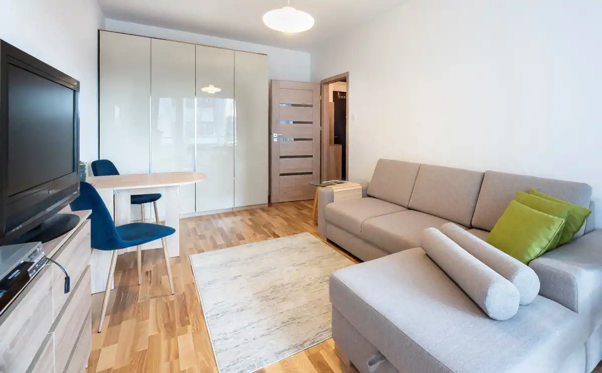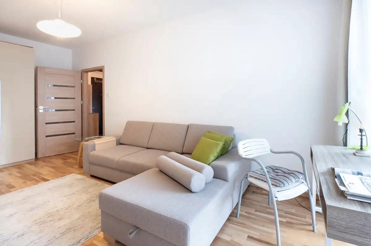 Dwie duże narożne kanapy z funkcją spania i pojemnikiem na pościel. W zależności od potrzeb najemcy w jednym z pokoi kanapa narożna może zostać zamieniona na wygodne dwuosobowe łóżko.