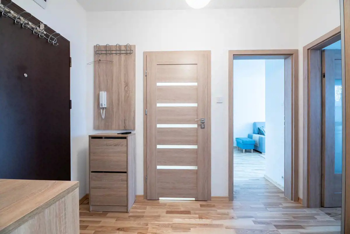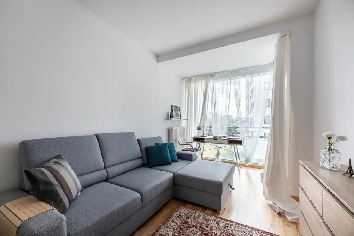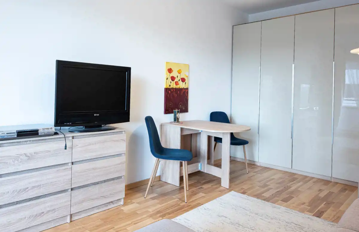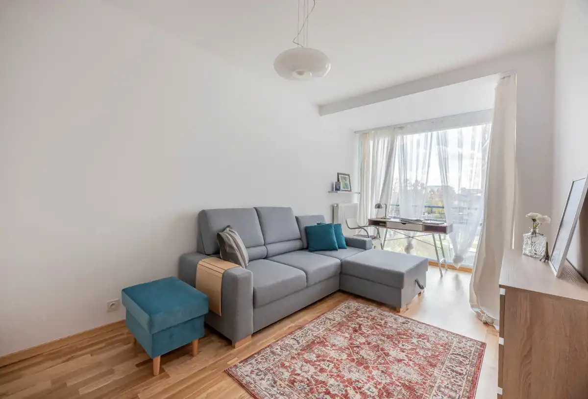 Dwie duże narożne kanapy z funkcją spania i pojemnikiem na pościel. W zależności od potrzeb najemcy w jednym z pokoi kanapa narożna może zostać zamieniona na wygodne dwuosobowe łóżko.