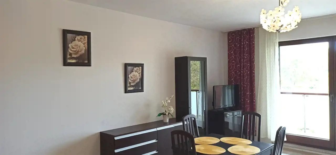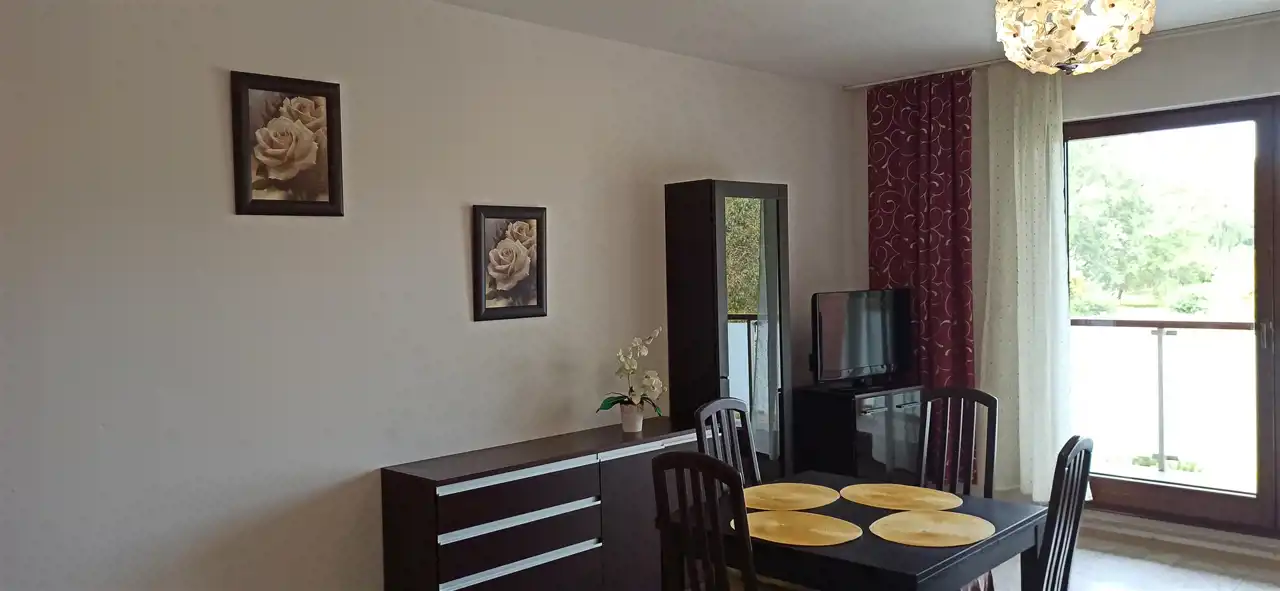 Rozkład - pokój z aneksem kuchennym, duża łazienka z wanną, pralką. Przedpokój z szafami wnękowymi. Niewątpliwym atutem jest spory balkon z widokiem na zieleń, gdzie można wypić poranną kawę....., odpocząć ! Mieszkanie umeblowane, wyposażone.