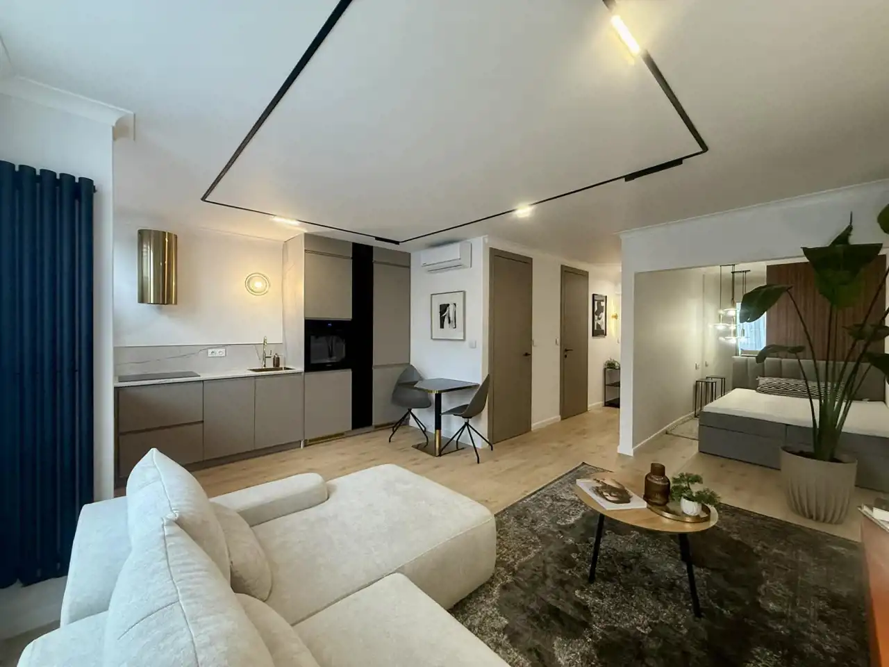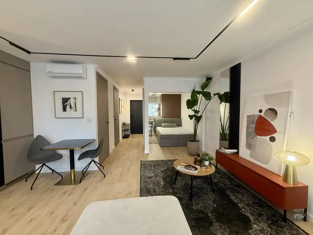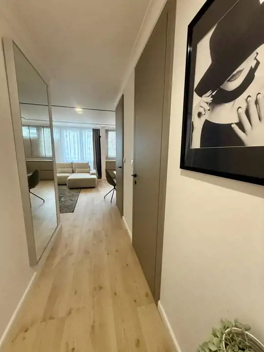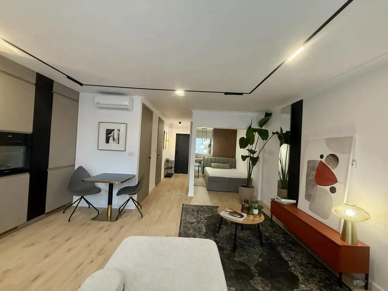 The 40m2 apartment comprises a living area with a comfortable sofa and kitchenette equipped wit appliances, separate sleeping area with comfortable large bed, an elegant bathroom with a shower tray, and separate dressing room with a washing machine