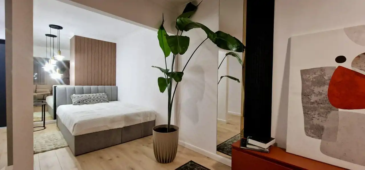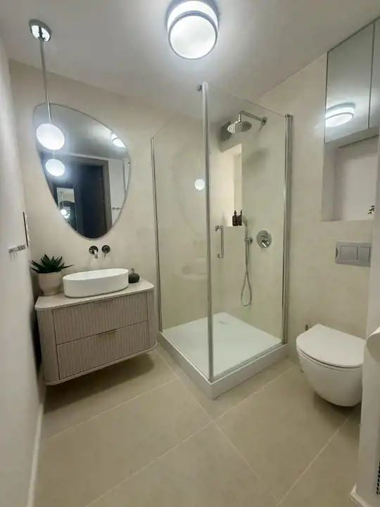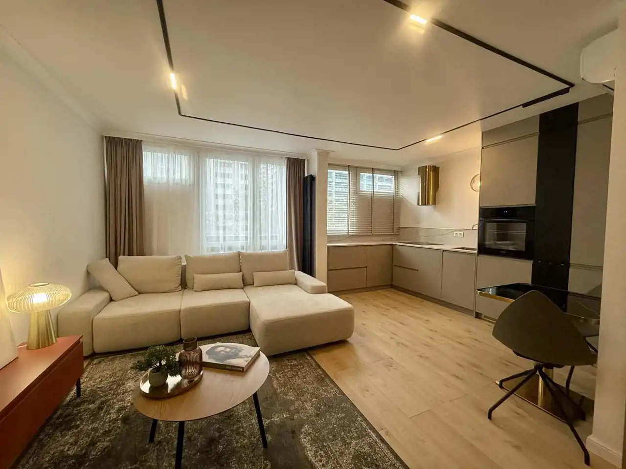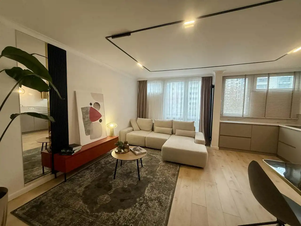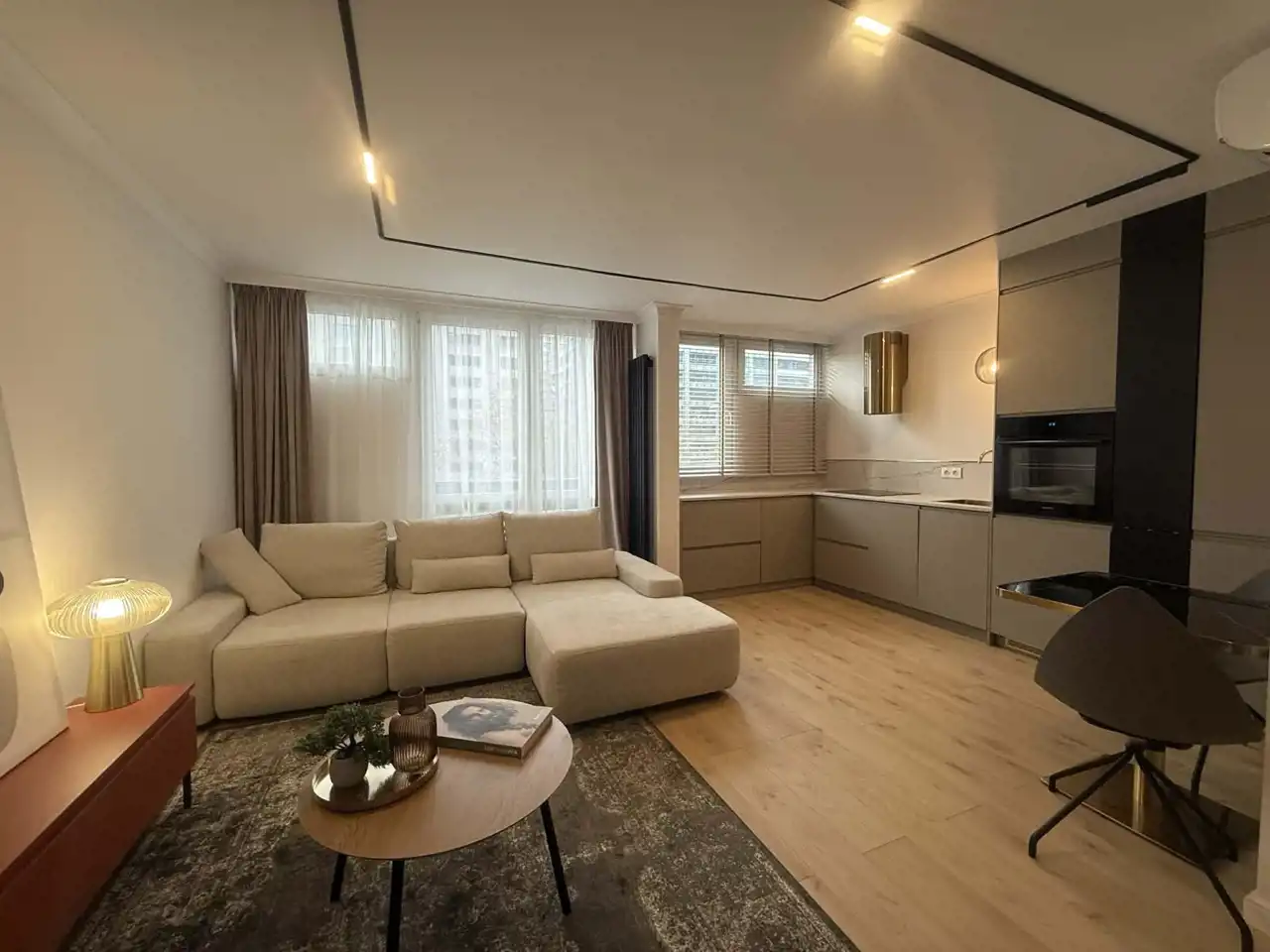 The 40m2 apartment comprises a living area with a comfortable sofa and kitchenette equipped wit appliances, separate sleeping area with comfortable large bed, an elegant bathroom with a shower tray, and separate dressing room with a washing machine