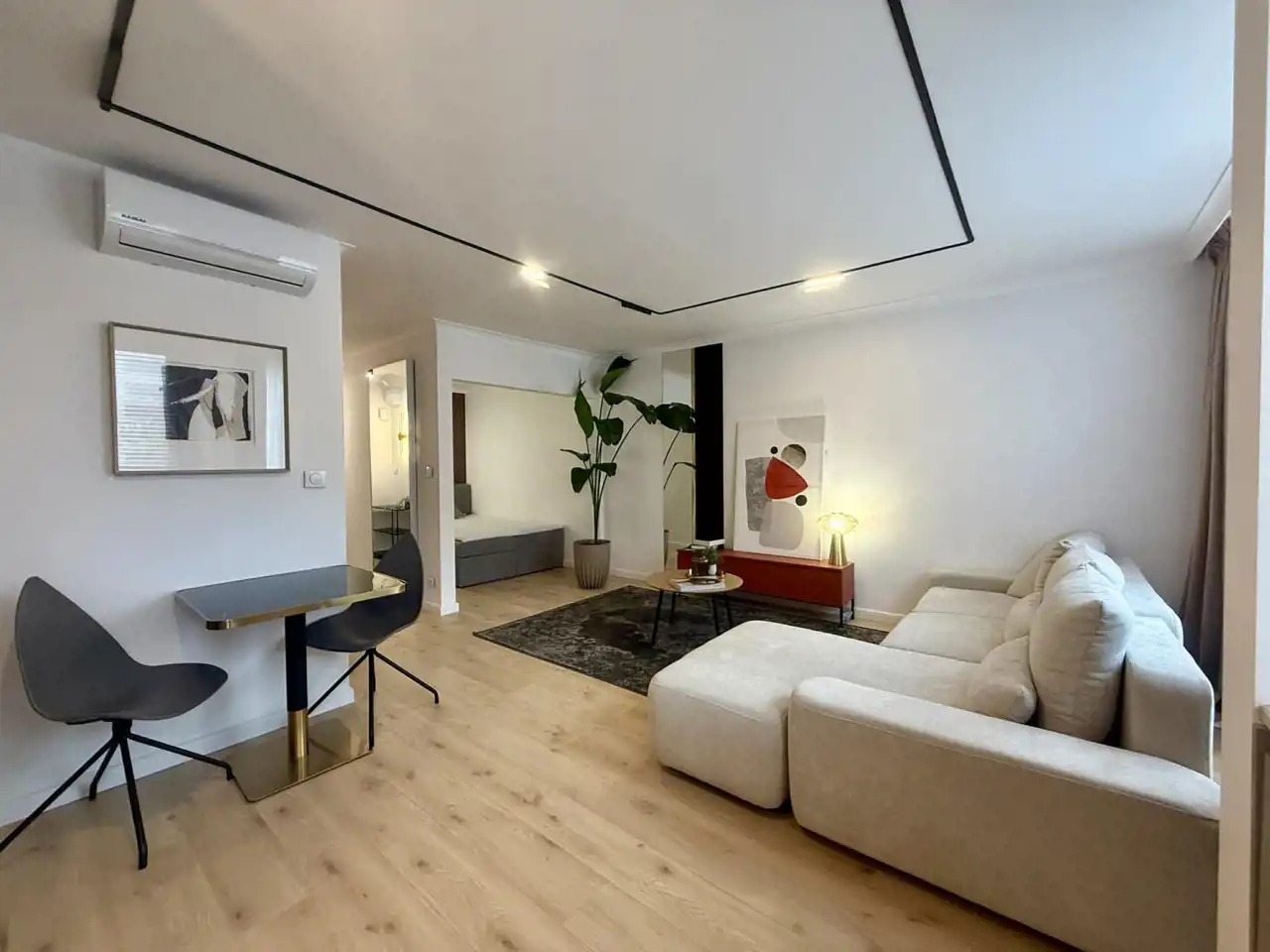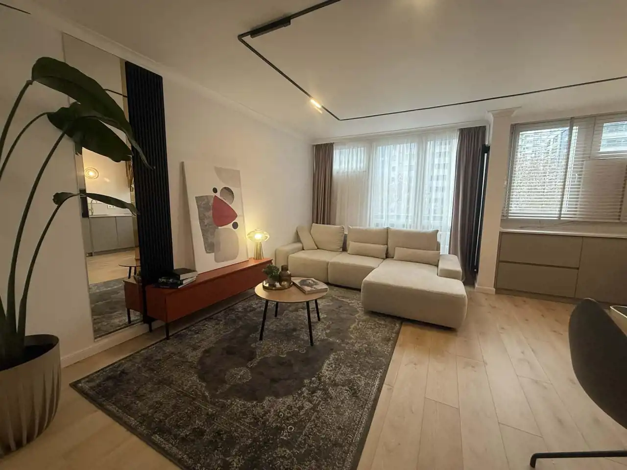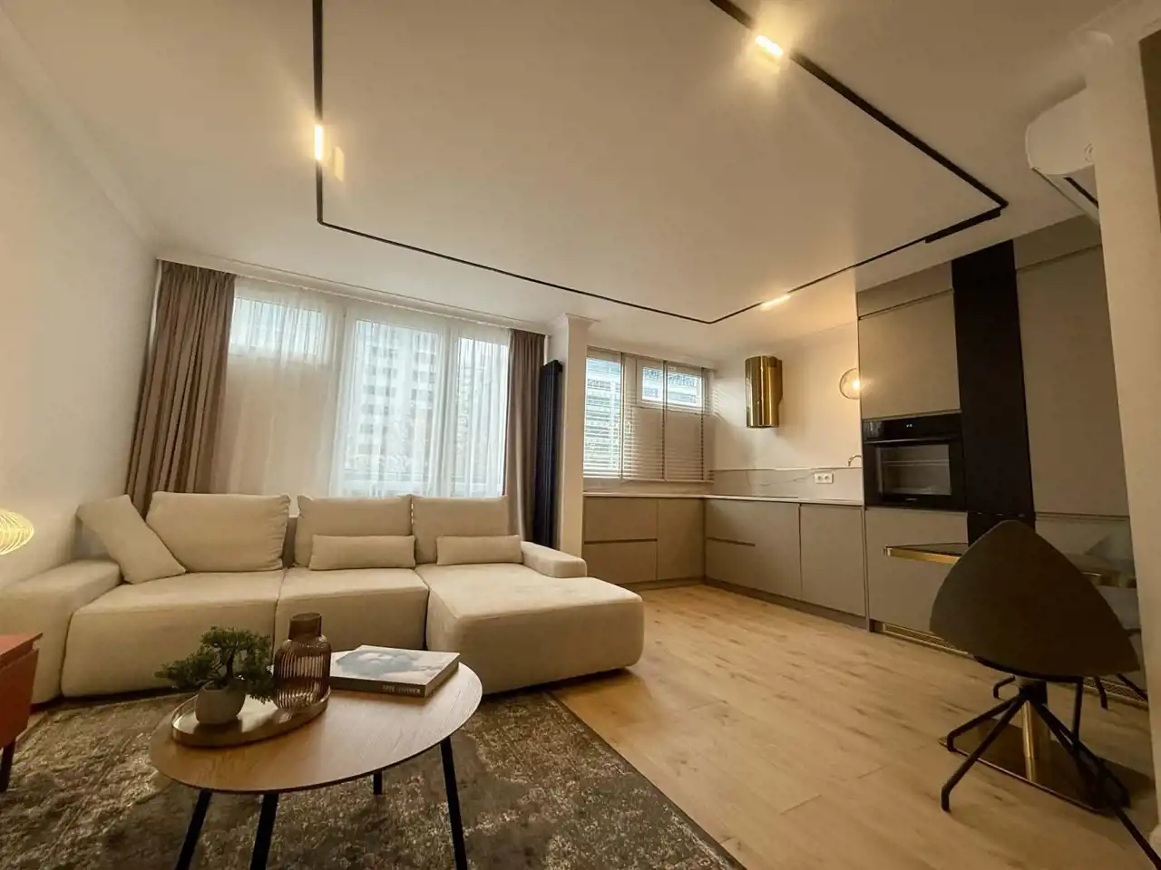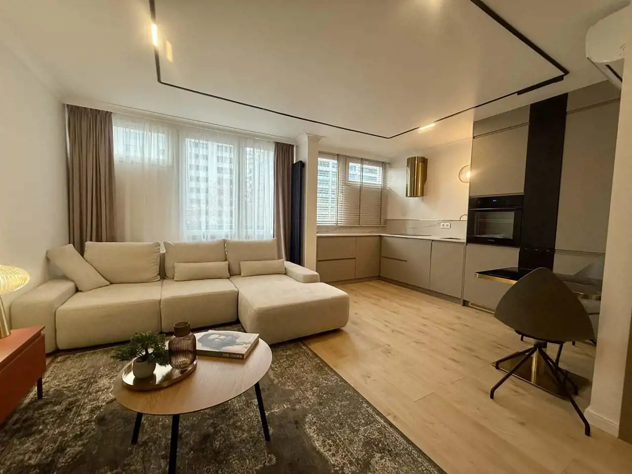 The 40m2 apartment comprises a living area with a comfortable sofa and kitchenette equipped wit appliances, separate sleeping area with comfortable large bed, an elegant bathroom with a shower tray, and separate dressing room with a washing machine