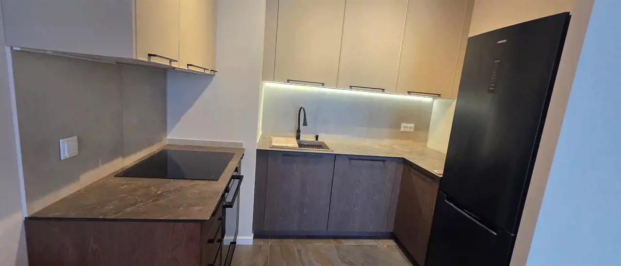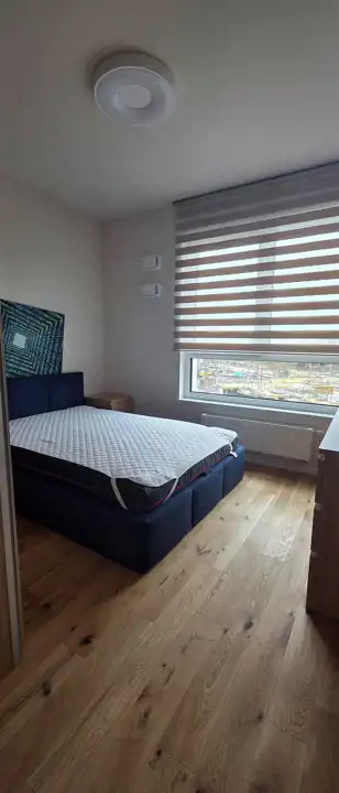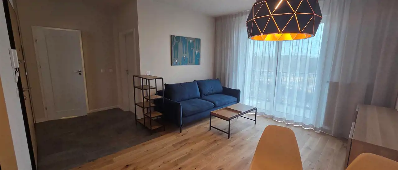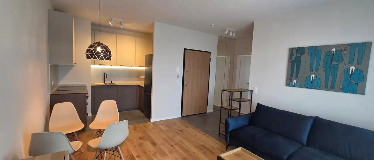 W salonie elegancka sofa z funkcją spania, stół, 4 krzesła; w sypialni dwuosobowe łóżko z dobrej klasy materacem, szafa; w kuchni nowoczesna zabudowa z lodówko/zamrażarką, płytą indukcyjną, okapem, piekarnikiem i zmywarką.