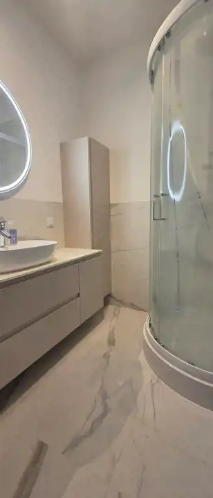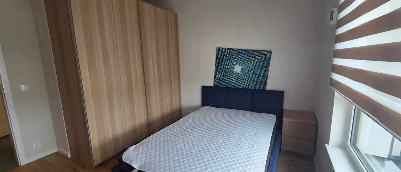sypialnia z dwuosobowym łóżkiem i szafą, łazienka z kabiną prysznicową, razem z toaletą; przedpokój z szafą.