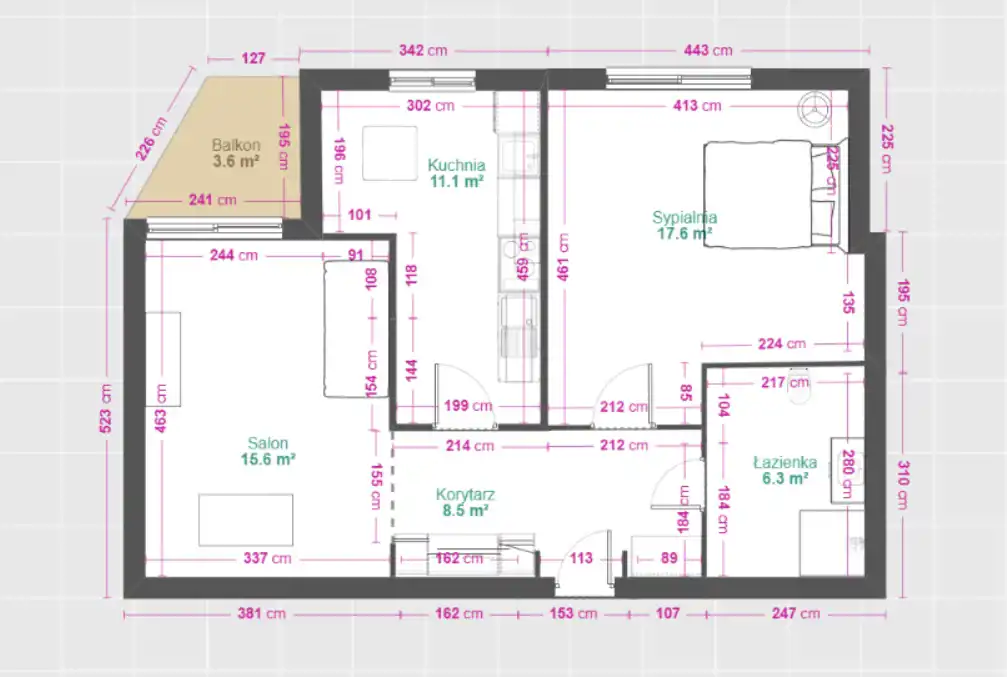 - Charakterystyka mieszkania 59.22 m2, 2 pokoje