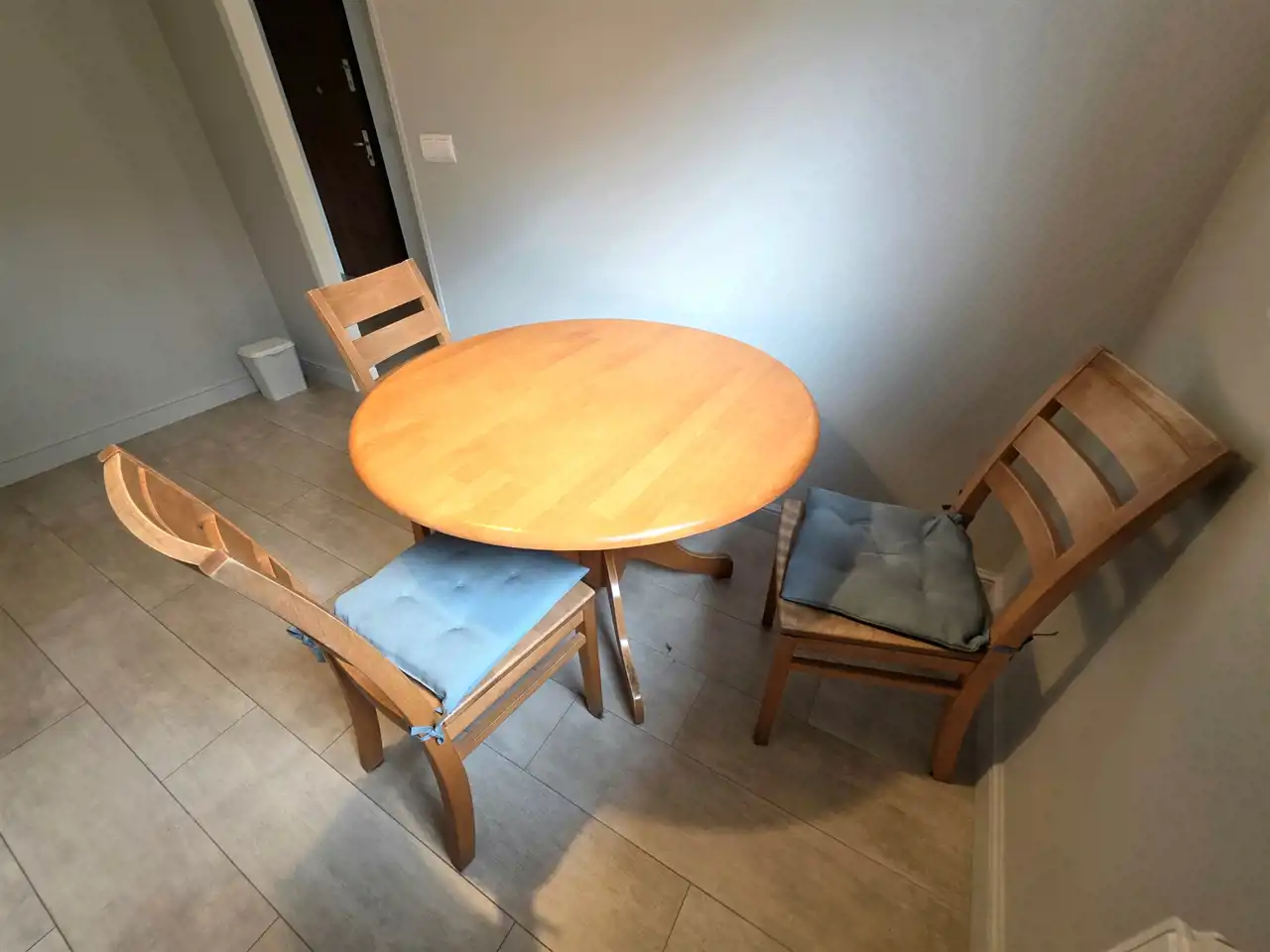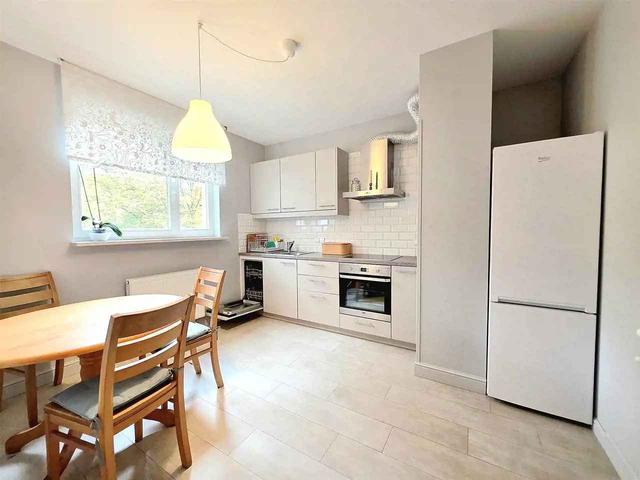 Wspaniała duża jasna kuchnia ze stołem i krzesłami, wyposażona w sprzęt AGD z nową lodówką, płytą indukcyjną, piekarnikiem, wyciągiem, zmywarką do naczyń.
