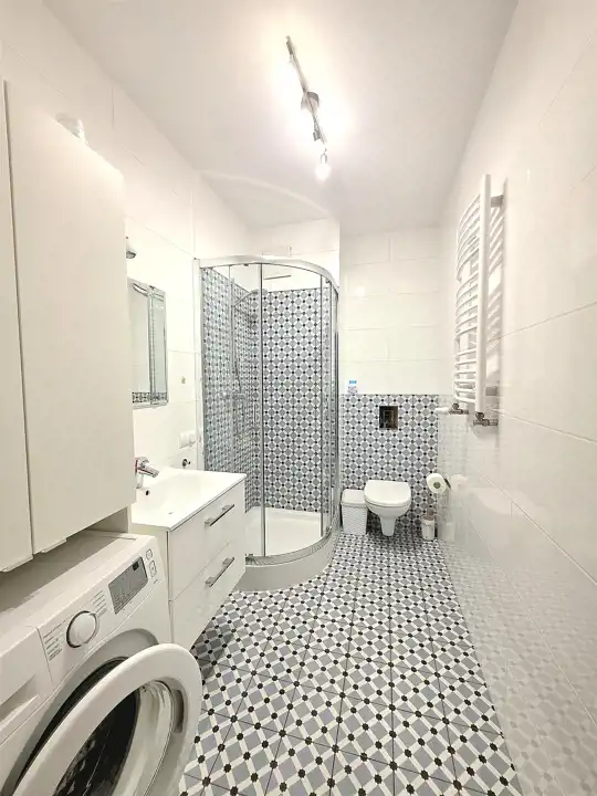 W łazience kabina prysznicowa i pralka oraz dwie szafeczki łazienkowe.