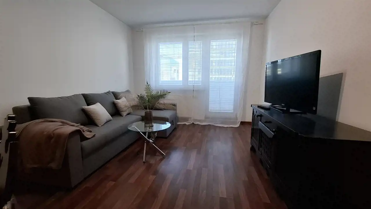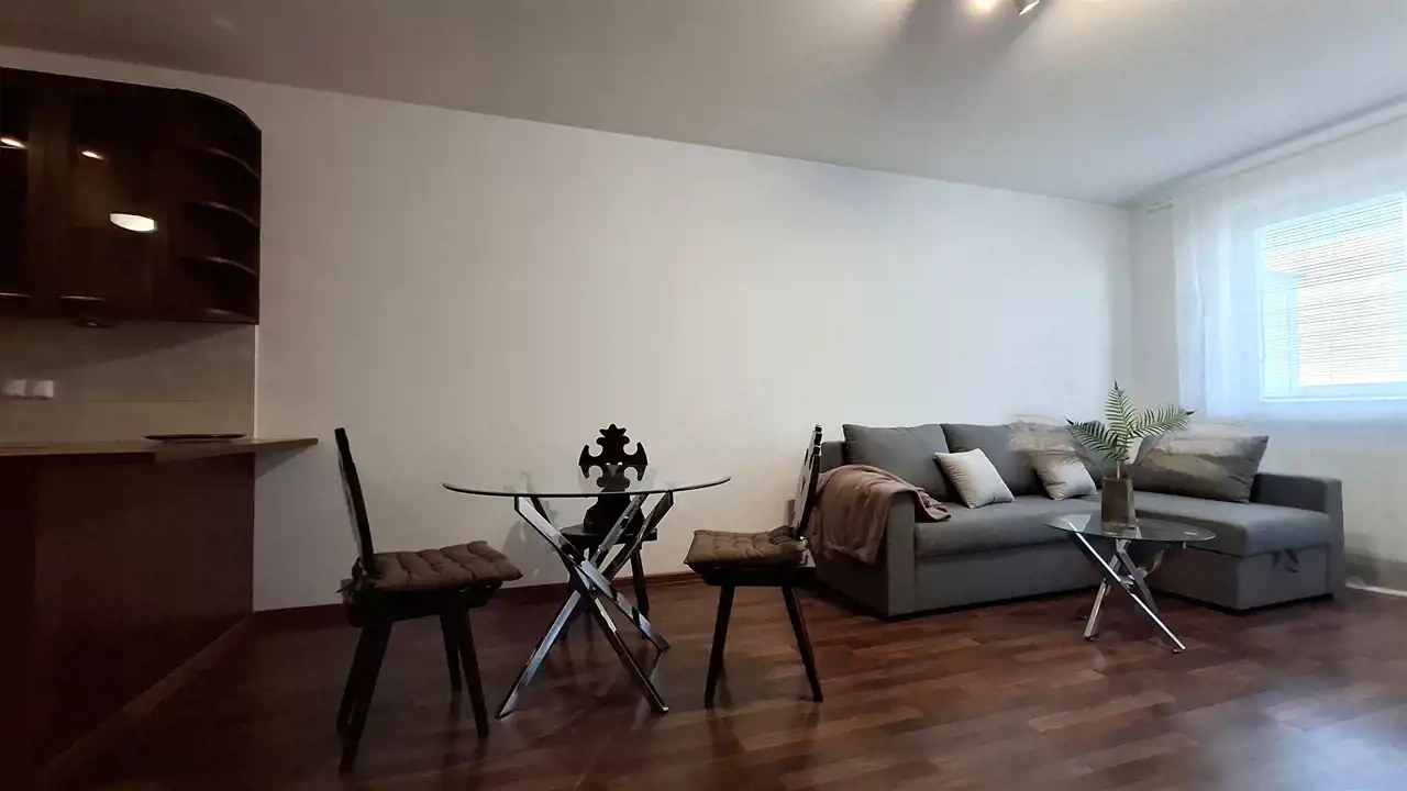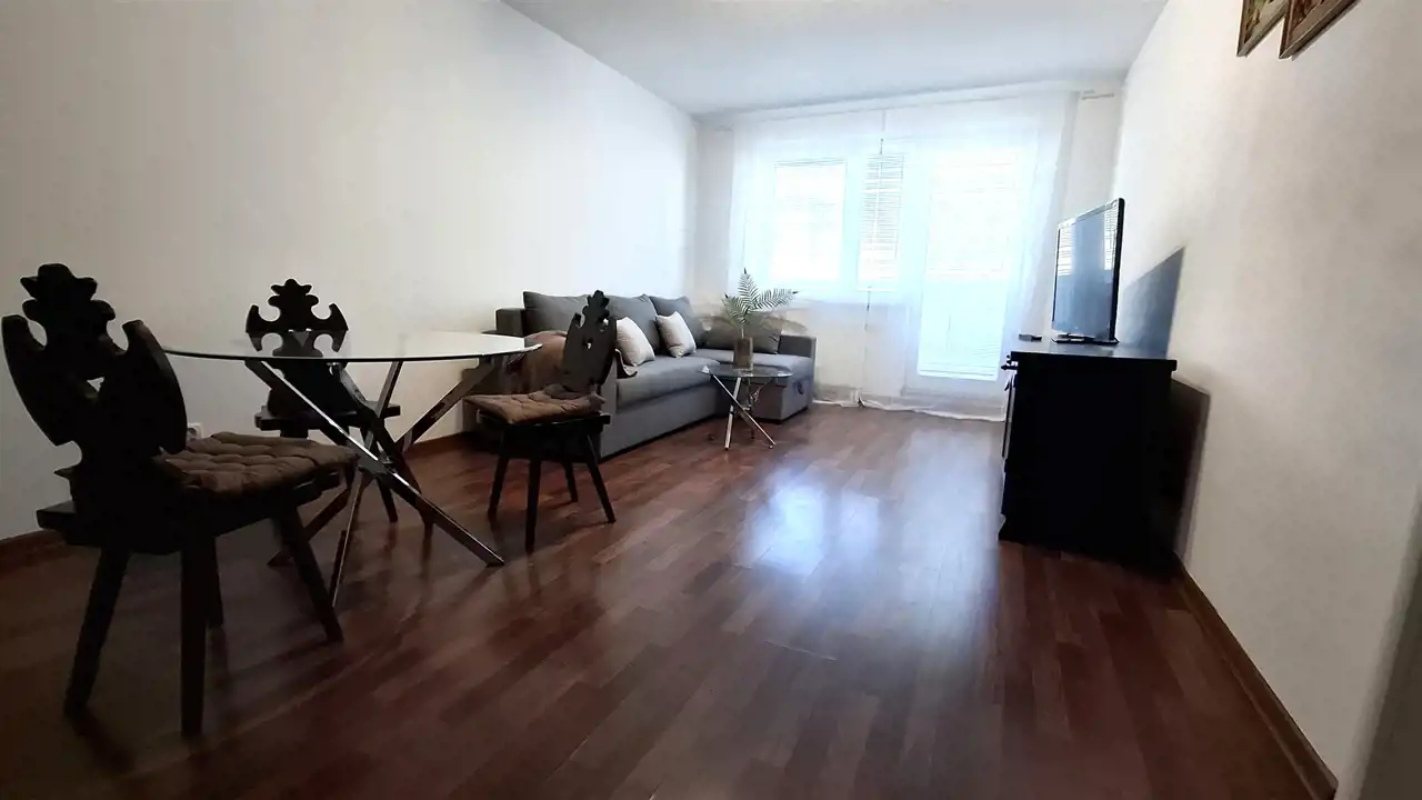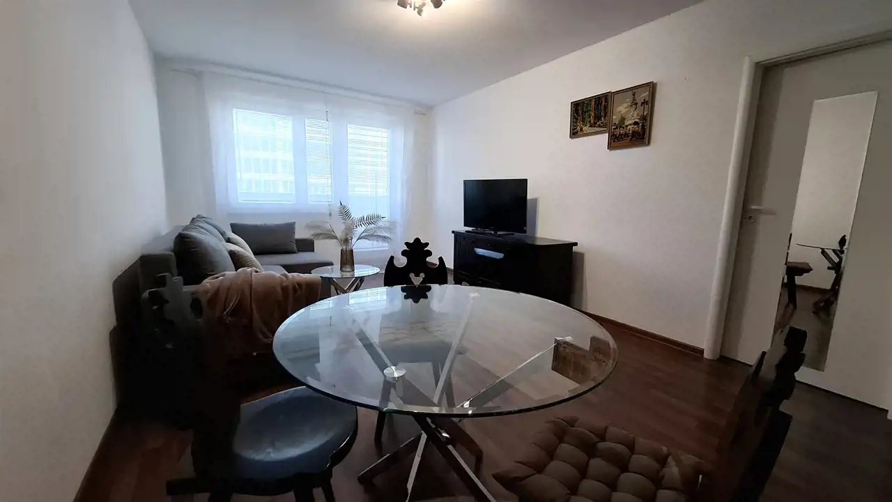 - an open living room with a newly purchased fold-out corner sofa, coffee and dining tables, and a TV.