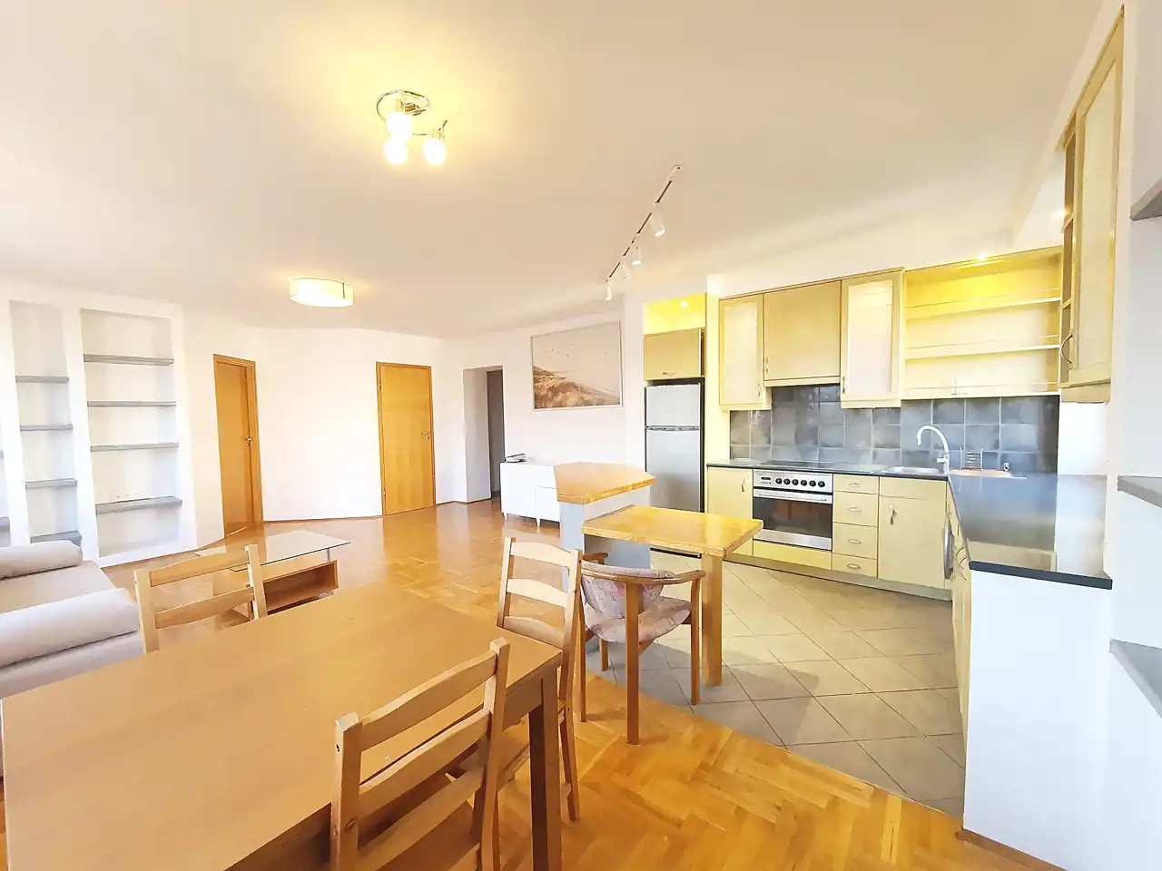 W pokoju dziennym znajduje się rozkładana kanapa, stół z krzesłami, komoda, duża ilość półek wbudowanych w ściany.