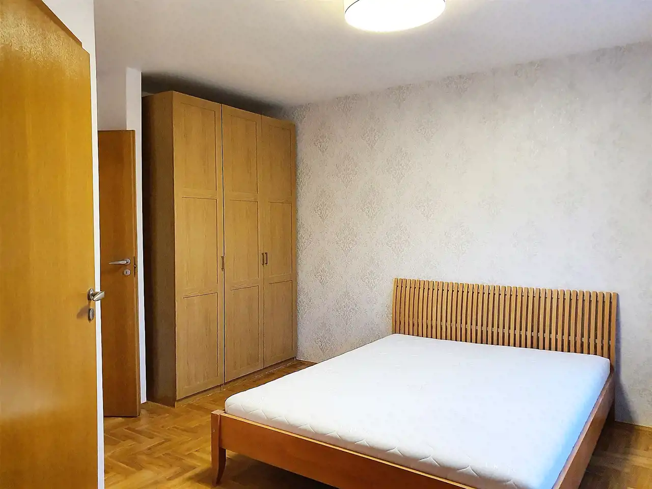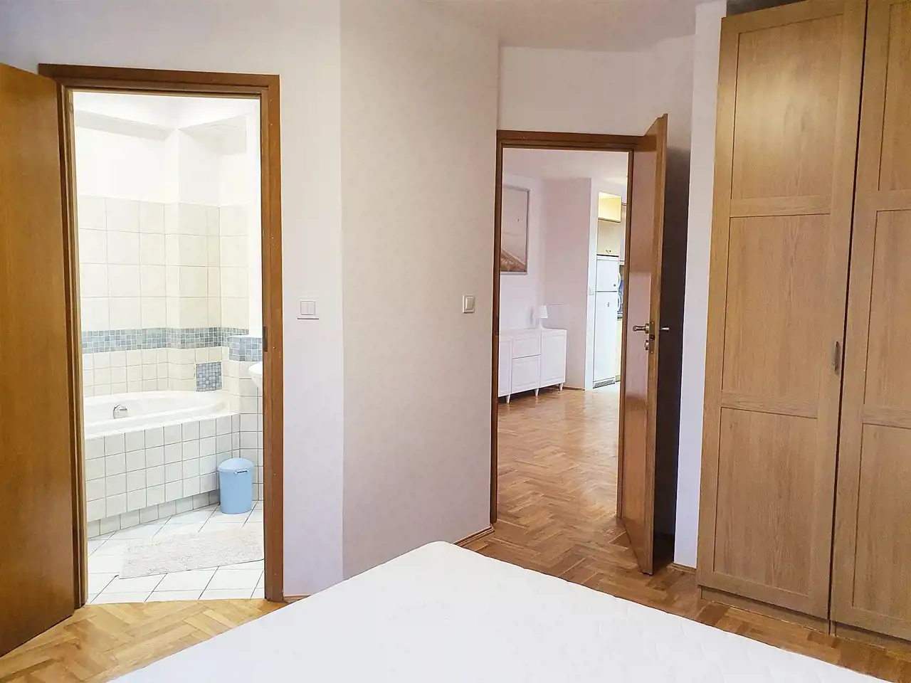 W sypialni jest podwójne łóżko, dwie szafy garderobiane.