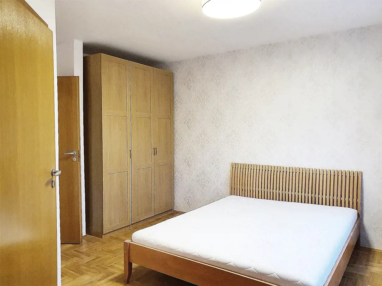 W sypialni jest podwójne łóżko, dwie szafy garderobiane.