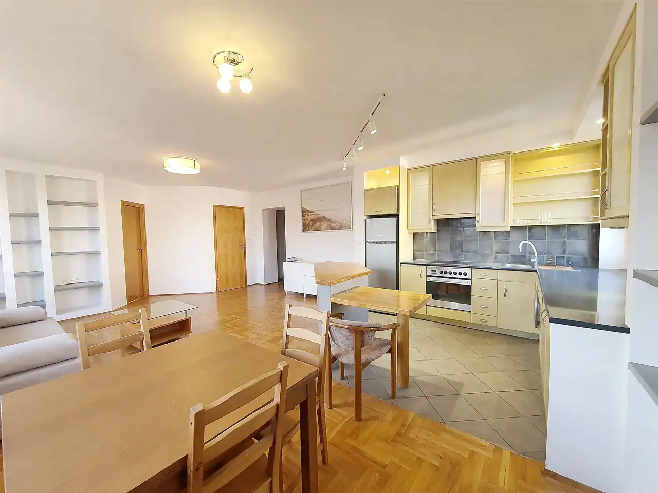 W pokoju dziennym znajduje się rozkładana kanapa, stół z krzesłami, komoda, stolik kawowy, duża ilość półek wbudowanych w ściany.