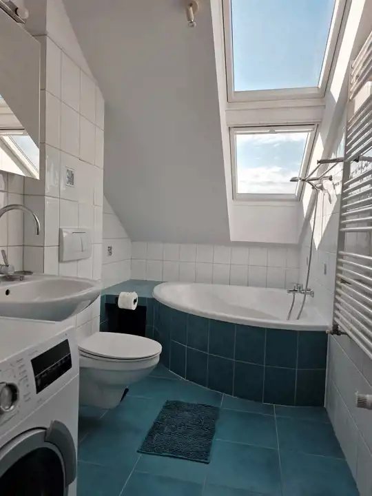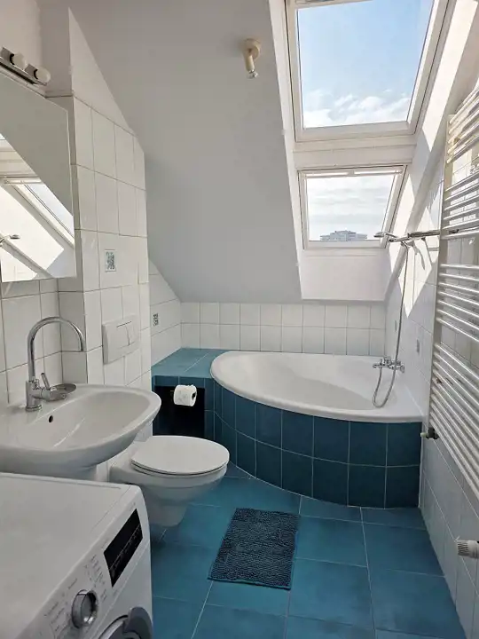 W łazience wanna narożna, a nad nią w suficie urocze okno dachowe.