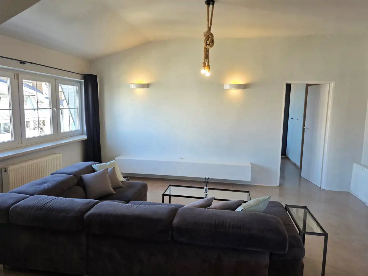 W całym mieszkaniu występuje dużo skosów i okien dachowych.