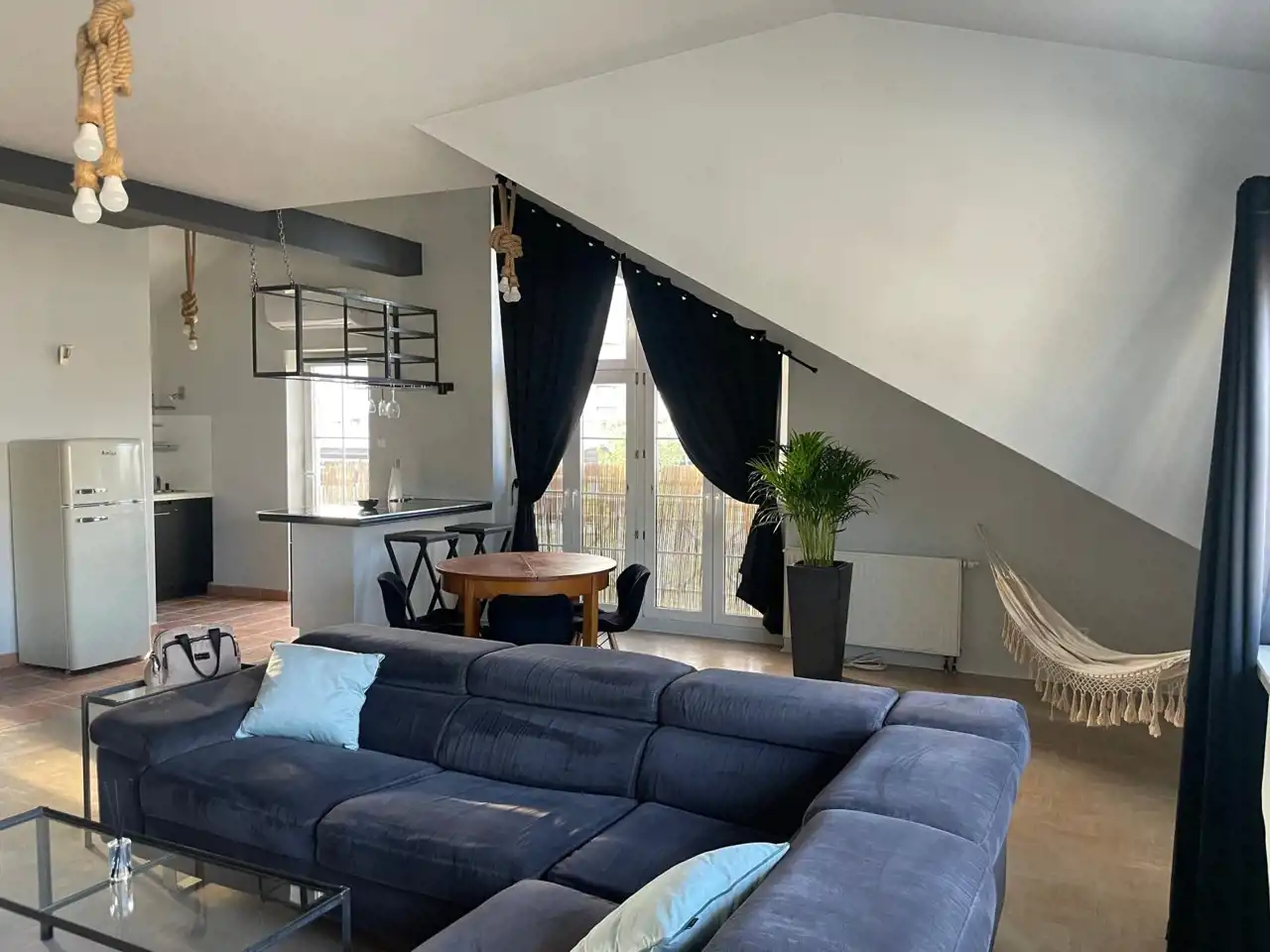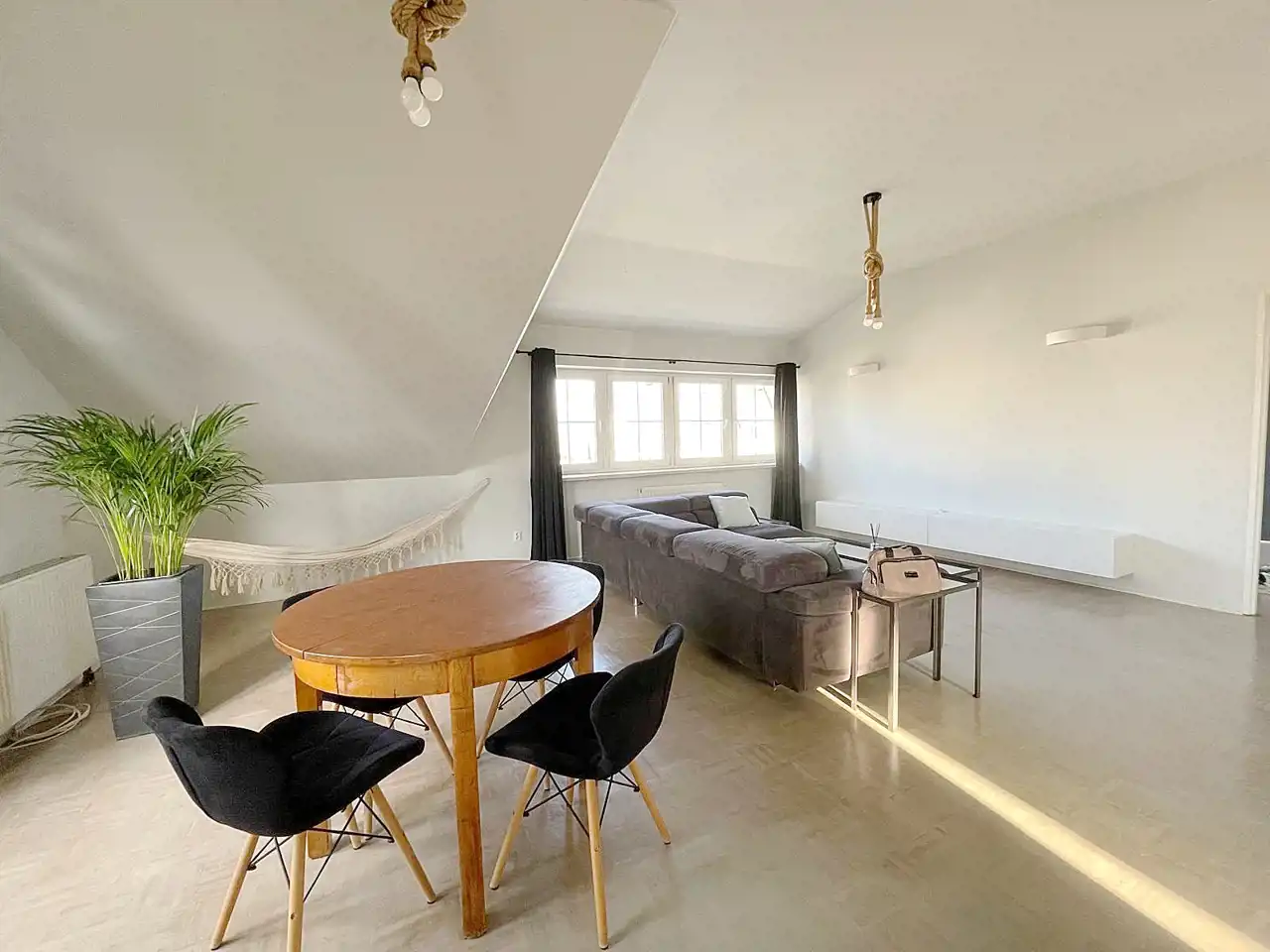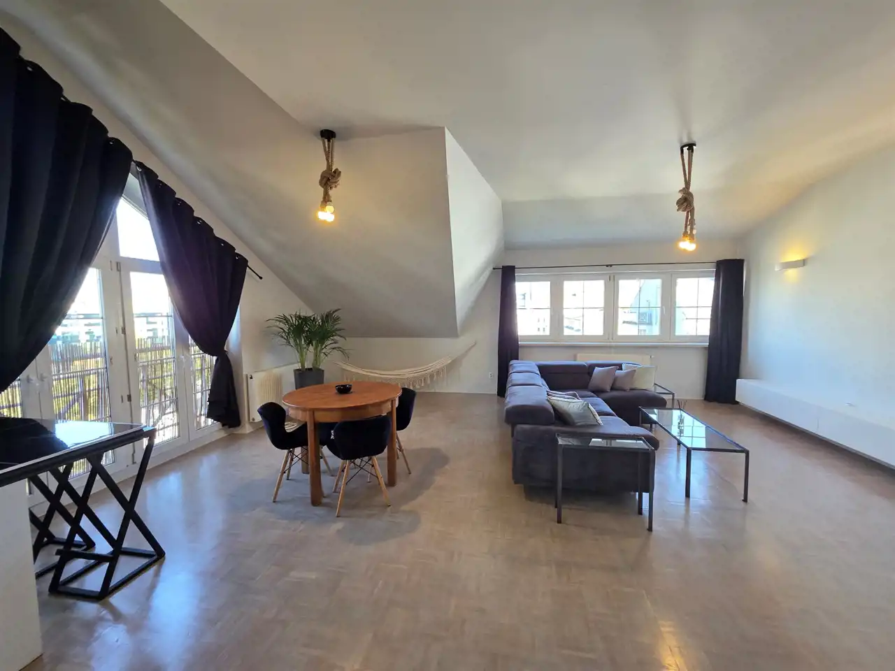 Mieszkanie częściowo z meblami (w pokoju dziennym jest kanapa, komoda, stoliki okolicznościowe, stół, hamak).
