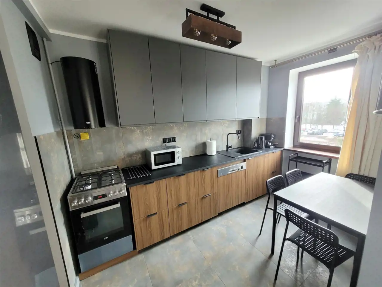 Kuchnia z oknem 8.2m2 (otwarta na pokój dzienny) - na podłodze terakota, na ścianie w pasie technologicznym gres, zabudowana nowymi meblami kuchennymi pod wymiar oraz wyposażona w sprzęt AGD (nowa kuchnia gazowo-elektryczna, nowy okap, nowa lodówko-zamrażarka, zmywarka) + stół z 4 krzesłami.