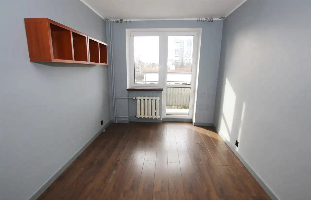 Pokój 11.4m2 - na podłodze panele, meble: szafa narożna. Z pokoju wyjście na balkon - loggię ok. 2.5m2