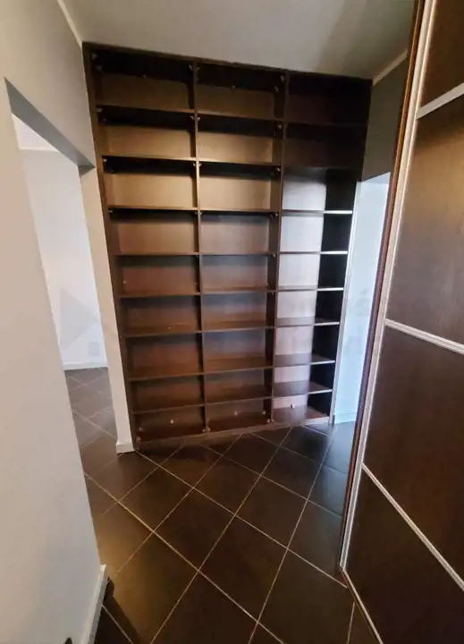 Przedpokój - na podłodze gres, dodatkowo znajdziemy tu zabudowaną bardzo pojemną szafę oraz biblioteczkę (zabudowany regał - otwarte półki).
