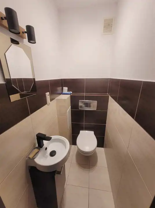 Toaleta 1.4m2 - terakota, glazura, umywalka z szafką, lustro.
