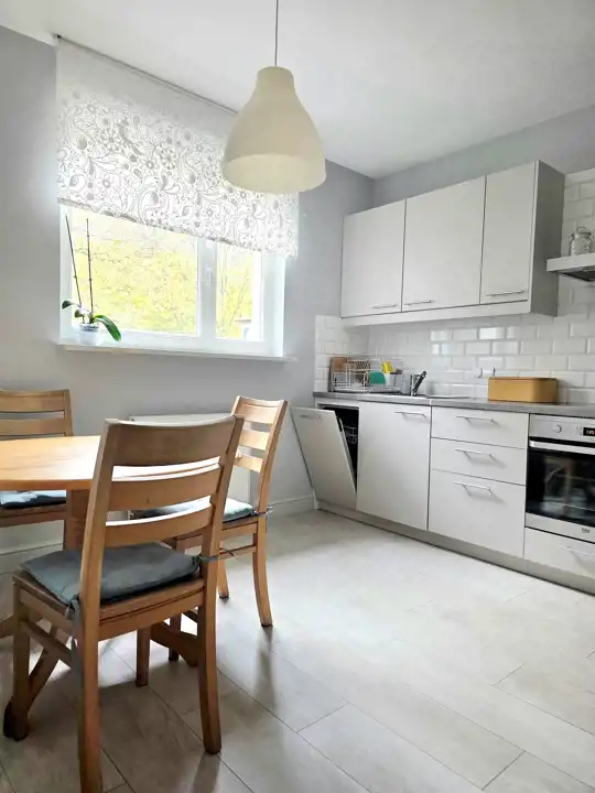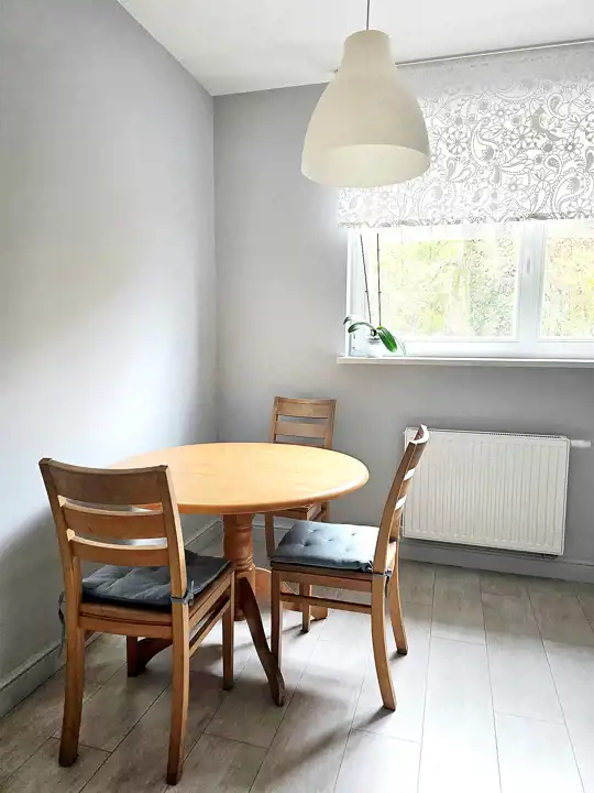 Kuchnia osobna, z oknem, urządzona ze stołem i krzesłami. Wyposażona w sprzęt AGD (nowa lodówka, płyta indukcyjna, piekarnik, wyciąg, zmywarka do naczyń).