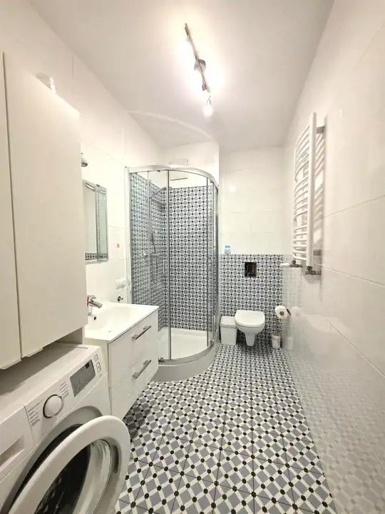 Łazienka z kabiną prysznicową i pralką oraz szafkami łazienkowymi.
