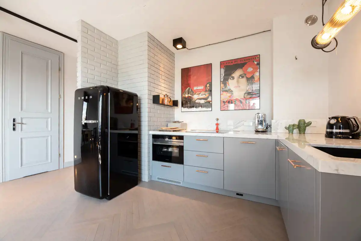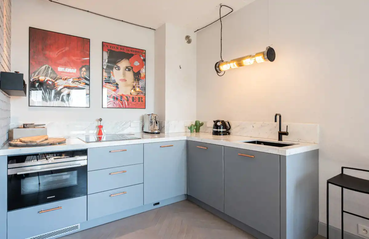 Zabudowa kuchenna wysokiej klasy, wykonana na wymiar z pełnym wyposażeniem AGD – wszystkie urządzenia nowe. Bardzo szeroki, przepiękny blat z marmuru carrara w stanie idealnym, przeznaczony do użytku dla osób znających specyfikę tego delikatnego kamienia.