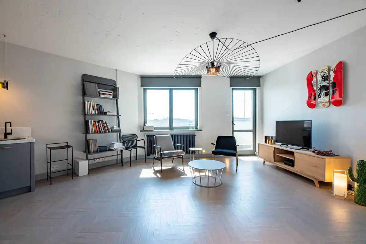 Efekt industrialny podbity jest designerskimi dodatkami z najnowszych katalogów wnętrzarskich, które spełniają funkcje użytkowe i cieszą oko.