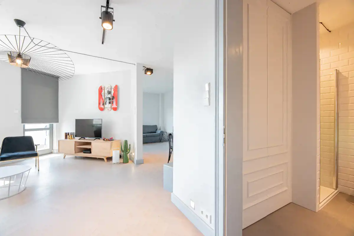 Mieszkanie na planie pół open space z wyraźnie wydzieloną i osłoniętą częścią na wypoczynek -sypialnię.
