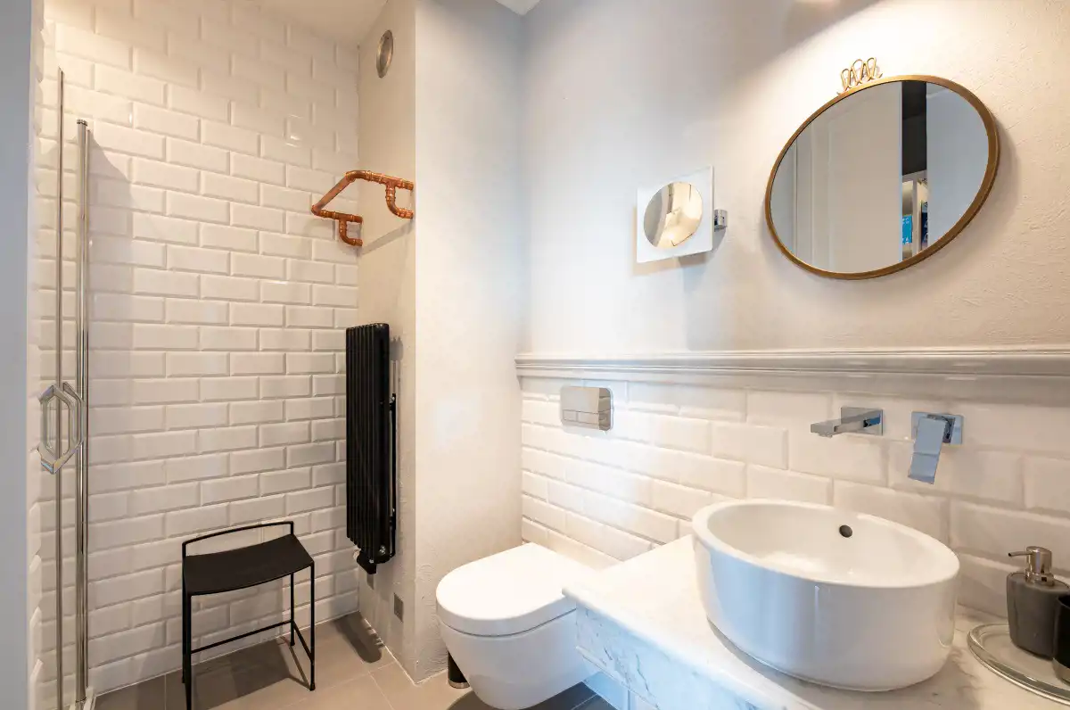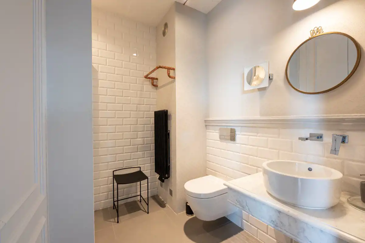Łazienka znakomicie zaprojektowana. W głębi duży prysznic typu walk – in. Zabudowa meblowa – pojemna szafa wykonana na wymiar mieści pralkę oraz pozostawia przestrzeń do przechowywania przedmiotów gospodarstwa domowego, ręczników, kosmetyków chemii łazienkowej itp... Umywalka łazienkowa na blacie z marmuru carrara. Wysokiej klasy armatura łazienkowa i biały montaż.