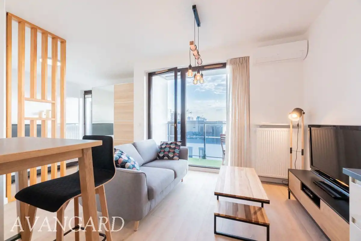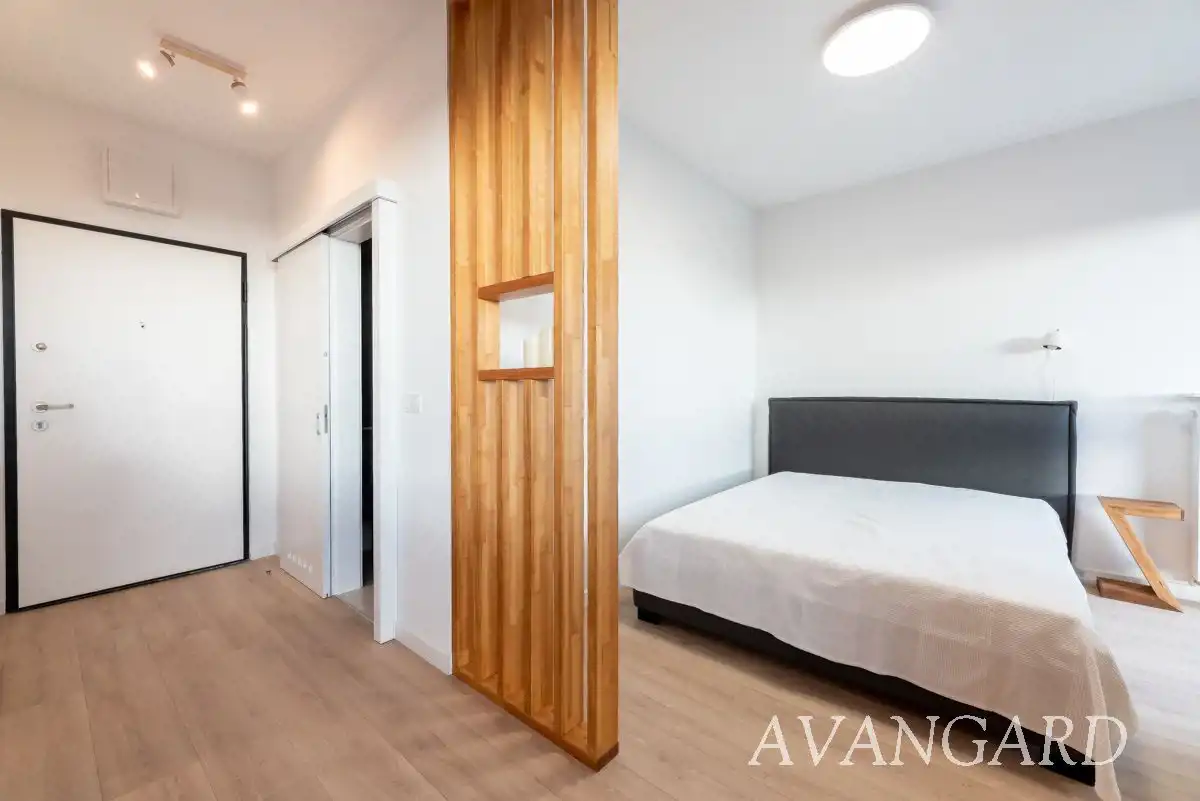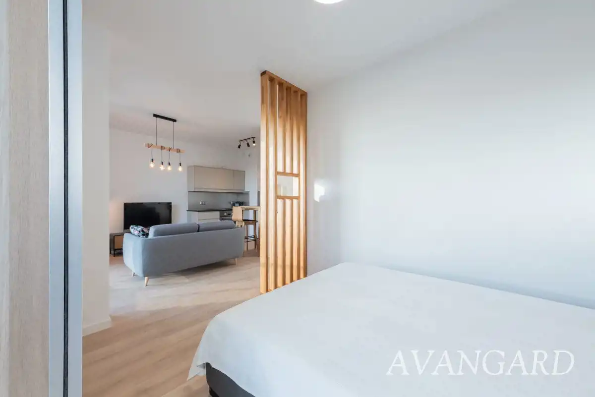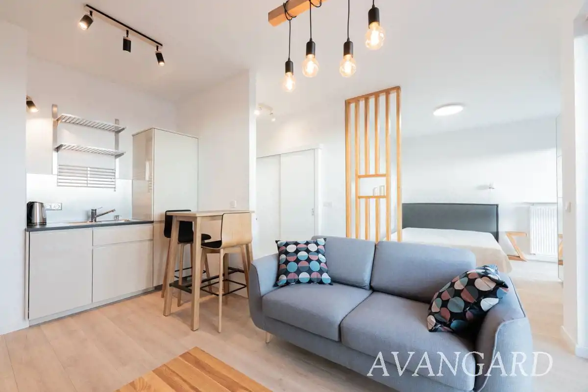 Oferujemy do wynajęcia od września, elegancki apartament zaaranżowany strefowo z podziałem na aneks kuchenny, cześć wypoczynkową, WIDNY aneks sypialny i łazienkę.