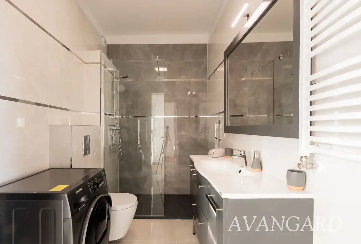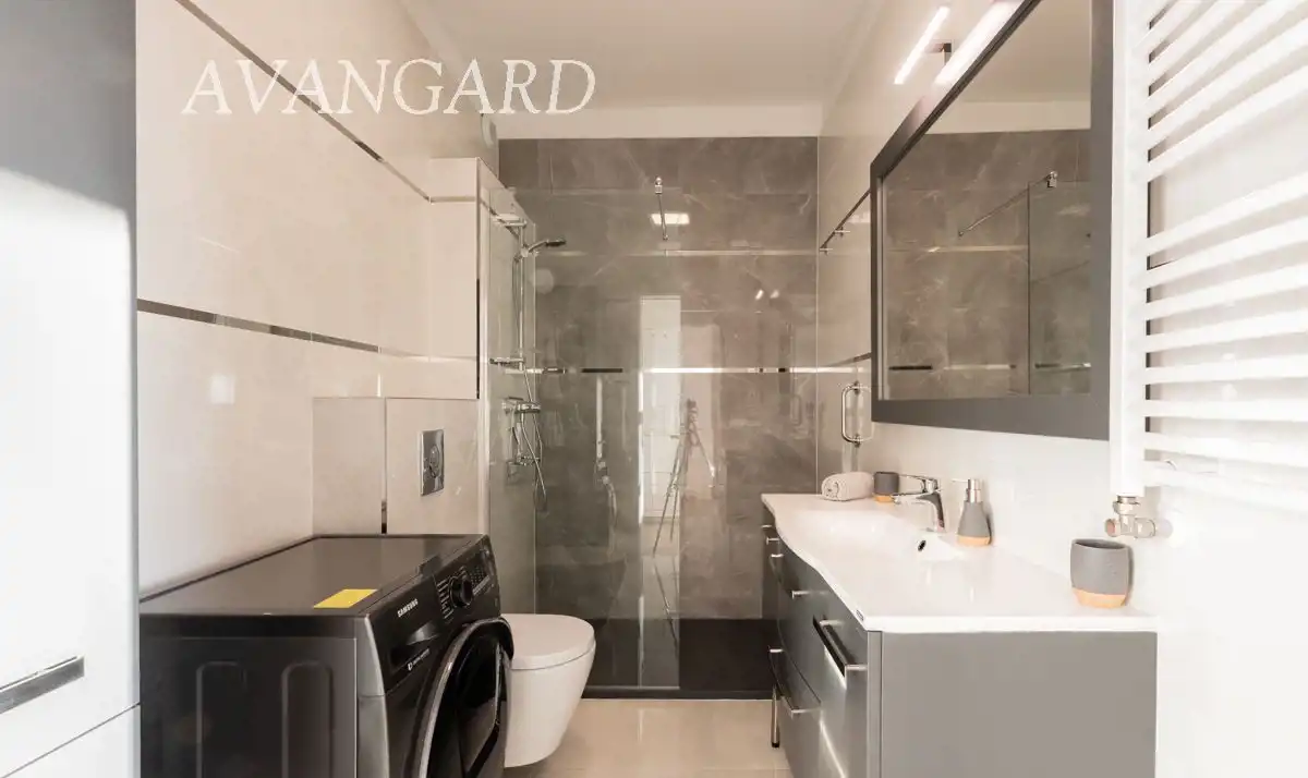 Wyjątkowo duża i komfortowa łazienka. Prysznic typu walk in bardzo przestronny, umywalka z blatem i dużą ilością szafek/szuflad, toaleta oraz pralka.
