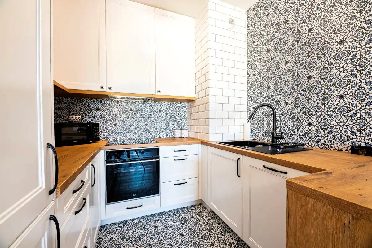 Wszystkie szafy w mieszkaniu i meble kuchenne robione na zamówienie pod wymiar.